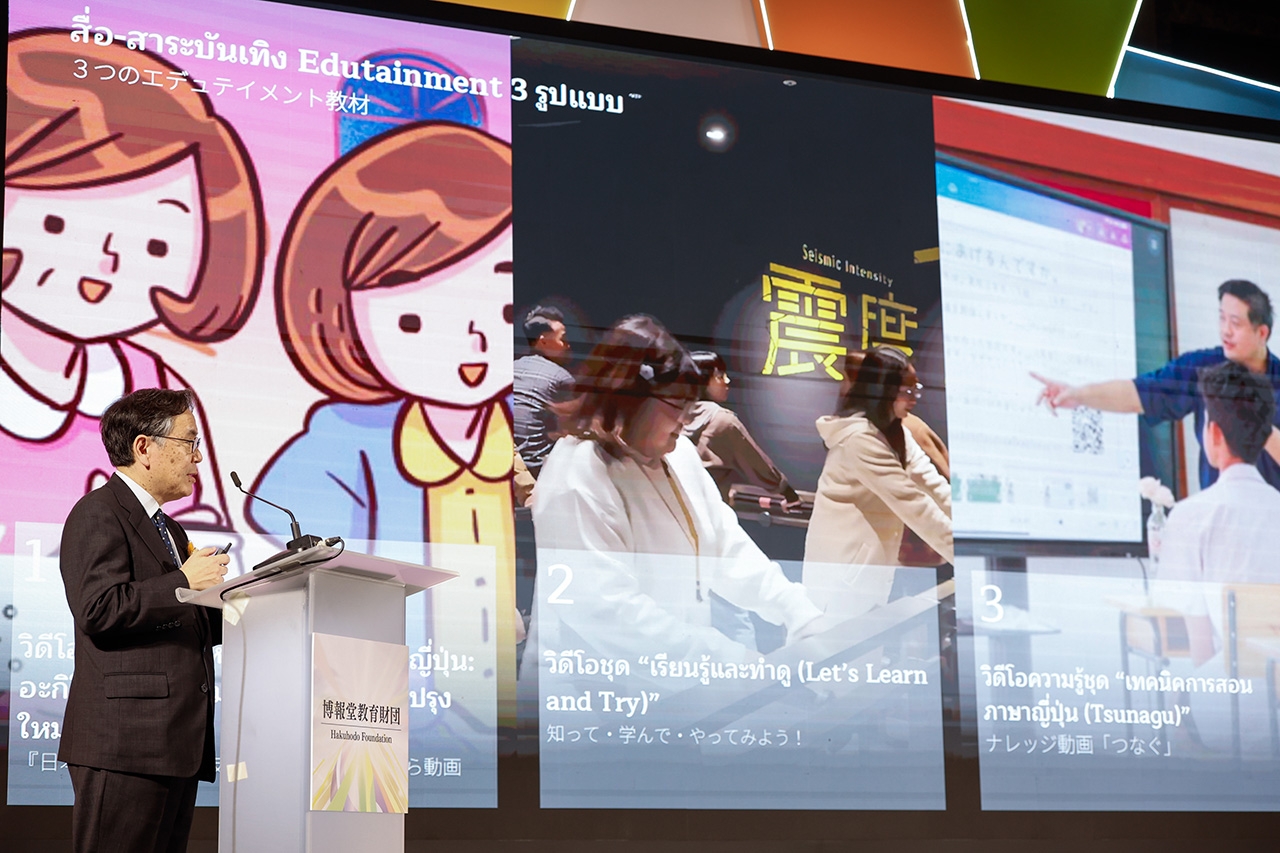 นายจุน ชูมะ กรรมการบริหารมูลนิธิฮาคูโฮโด (Hakuhodo Foundation) เปิดเผยว่า มูลนิธิฮาคูโฮโด ก่อตั้งขึ้นเมื่อ พ.ศ. 2513 โดยมีวัตถุประสงค์เพื่อสนับสนุนการศึกษาภาษาญี่ปุ่นสำหรับเยาวชนและการศึกษาสำหรับผู้พิการ รวมไปถึงการมีส่วนสนับสนุนในการพัฒนาผู้คนให้มีความสมบูรณ์ทั้งทางกาย ใจ และสังคม เราจึงได้ริเริ่มโครงการต่าง ๆ เช่น รางวัลฮาคูโฮ ทุนวิจัยเพื่อการพัฒนาการศึกษาของเยาวชน และทุนการศึกษาสำหรับการฝึกอบรมครู และในปี พ.ศ. 2563 ที่ผ่านมา เนื่องในโอกาสครบรอบ 50 ปีของมูลนิธิฮาคูโฮโด ทางมูลนิธิได้เปิดตัวโครงการการศึกษาภาษาญี่ปุ่น (Japanese Language Program) ซึ่งมุ่งเน้นสนับสนุนการพัฒนาการศึกษาภาษาญี่ปุ่นให้กับเยาวชนในต่างประเทศ