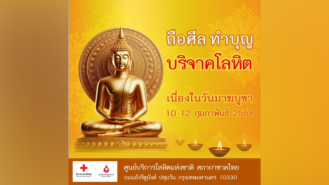 ศูนย์บริการโลหิตแห่งชาติ สภากาชาดไทย ชวนพุทธศาสนิกชนถือศีล ทำบุญ บริจาคโลหิตเนื่องในสัปดาห์วันมาฆบูชา ระหว่างวันที่ 10 - 12 กุมภาพันธ์ 2568 ณ ศูนย์บริการโลหิตแห่งชาติ หน่วยรับบริจาคโลหิตประจำที่ ภาคบริการโลหิตแห่งชาติ 12 แห่ง และโรงพยาบาลสาขาบริการโลหิตแห่งชาติทั่วประเทศ