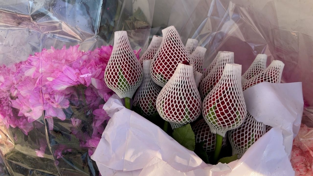 นางสุนันท์ กลิ่นกุหลาบ อายุ 54 ปี เจ้าของร้านขายพวงมาลัยและดอกไม้สด เผยว่า ราคาดอกกุหลาบปีนี้รุนแรงมาก กำละ 500 บาท ได้ 20 ดอก ตกดอกละ 25 บาทแล้ว ราคาปีที่แล้วอยู่ที่กำละไม่เกิน 300 บาท ปีนี้ก้าวกระโดดมาก แต่พอมาจัดช่อก็ต้องคิดอีกราคา เพราะพวกดอกที่ใช้ตกแต่งจัดช่ออย่างดอกคัตเตอร์ ดอกมัม จาก 80 เป็น 120 บาท ตนก็ต้องปรับตัว รับมาให้น้อยลง ขายน้อยลง เพราะถ้าเอามาเยอะแล้วเหลือก็เข้าเนื้ออีก ปีนี้ถือว่า ดอกกุหลาบ ดอกไม้ต่างๆ แพงที่สุดในรอบ 20 ปี ที่ตนขายมาเลยทีเดียว ตั้งแต่ขายมาไม่เคยเจอราคาดอกไม้พุ่งติดเพดาน ติดลมบนเช่นนี้มาก่อนในชีวิต
