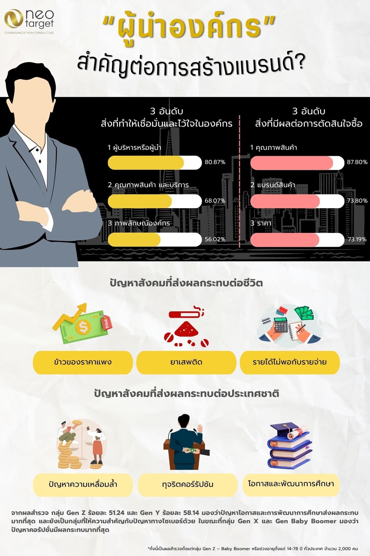 นิโอ ทาร์เก็ต ได้ทำการสำรวจความเห็นผู้บริโภคมาหลายปีติดต่อกัน ในปีนี้ เราได้ทำการสำรวจความเห็นผู้บริโภคอีกครั้ง โดยการสำรวจดังกล่าวครอบคลุมกลุ่มเป้าหมายที่กว้างขึ้น คือ ตั้งแต่กลุ่ม Gen Z ไปจนถึงกลุ่ม Baby Boomer ที่มีช่วงอายุตั้งแต่ 14-78 ปี ทั่วประเทศ จำนวน 2,000 คน เป้าหมายหลักคือหาปัจจัยที่มีอิทธิพลต่อการสร้างชื่อเสียงขององค์กร และปัจจัยที่มีผลต่อความรู้สึกที่ดีต่อแบรนด์ รวมทั้งการตัดสินใจซื้อคืออะไร ผลการสำรวจพบว่า คนไทยทุก Gen กว่าร้อยละ 80 (80.87%) ต่างให้ความเห็นในแนวทางเดียวกันว่า ผู้บริหาร หรือผู้นำองค์กร เป็นคนที่สำคัญมากที่สุดต่อการสร้างความเชื่อมั่นและความไว้วางใจ (Trust) กับองค์กร โดยผลสำรวจพบว่า บริษัทที่ได้รับความเชื่อมั่นหรือไว้วางใจมากที่สุด 3 อันดับแรก ได้แก่ บริษัท ปตท. จำกัด (มหาชน), บริษัท ซีพี ออลล์ จำกัด และบริษัท บุญรอดบริวเวอรี่ จำกัด โดยเหตุผลสำคัญมาจากความเชื่อมั่นในความสามารถขององค์กร มากถึงร้อยละ 22.29 รองลงมาคือความน่าเชื่อถือขององค์กร ร้อยละ 17.92 และร้อยละ 17.77 มีความเชื่อมั่นในผู้บริหารองค์กร ส่วนปัจจัยที่มีผลต่อการตัดสินใจซื้อสินค้าและบริการมากที่สุด ร้อยละ 87.80 อยู่ที่คุณภาพของสินค้า ร้อยละ 73.80 ชื่อเสียงของแบรนด์สินค้า และร้อยละ 73.19 คือเรื่องราคา