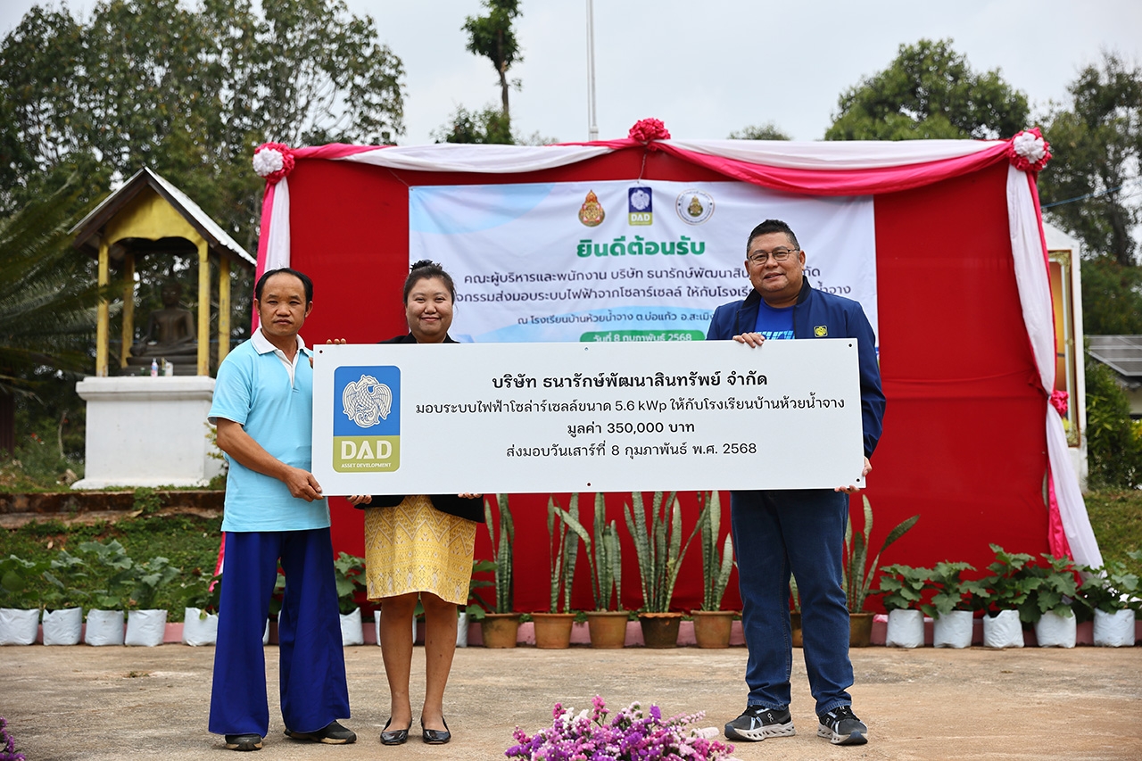 เมื่อวันที่ 8 มกราคม 2568 ดร. ธีธัช สุขสะอาด รองกรรมการผู้จัดการ พร้อมผู้บริหารและพนักงาน บริษัท ธนารักษ์พัฒนาสินทรัพย์ จำกัด หรือ DAD Asset Development มอบระบบไฟฟ้าโซล่าร์เซลล์ขนาด 5.6 KWh มูลค่า 350,000 บาท ให้แก่โรงเรียนบ้านห้วยน้ำจาง โดยมีนางสาวศิราพร อรินแก้ว ผู้อำนวยการโรงเรียน เป็นผู้รับมอบ ณ โรงเรียนบ้านห้วยน้ำจาง อำเภอสะเมิง จังหวัดเชียงใหม่