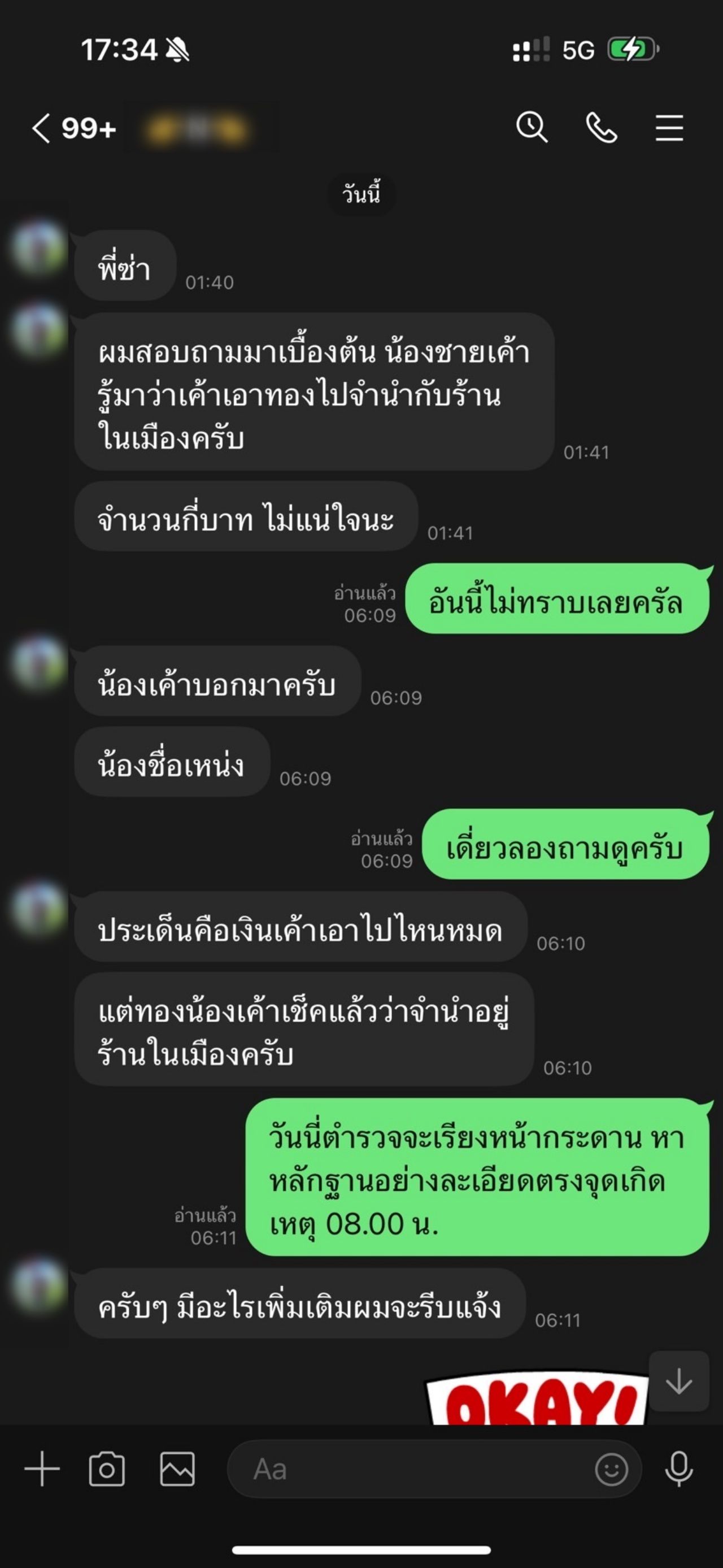 ต่อมาในช่วงเวลา 01.40 น. ของวันที่ 14 ก.พ.68 "นายโน้ต" ได้ทำทีส่งข้อความมาใน Line ของผู้สื่อข่าว ลักษณะแจ้งบอกแสว่าได้ข้อมูลจาก "นายโป๊งเหน่ง หรือนายบอล" น้องชายเมียผู้ตาย แจ้งว่าผู้ตายนำทองคำไปจำนำในตัวเมืองกำแพงเพชร จำนวนกี่บาทไม่แน่ใจ และถามว่ารู้เบาะแสหรือไม่? ซึ่งผู้สื่อข่าวก็ตอบไปว่าไม่ทราบข้อมูลนี้ พร้อมแจ้งว่าพรุ่งนี้ 08.00 น. เจ้าหน้าที่ตำรวจจะเรียงหน้ากระดานค้นหาหลักฐานที่จุดเกิดเหตุอย่างละเอียด โดยนายโน้ตได้ตอบกลับมาว่าหากตนได้ข้อมูลอะไรจะรีบแจ้งทันที