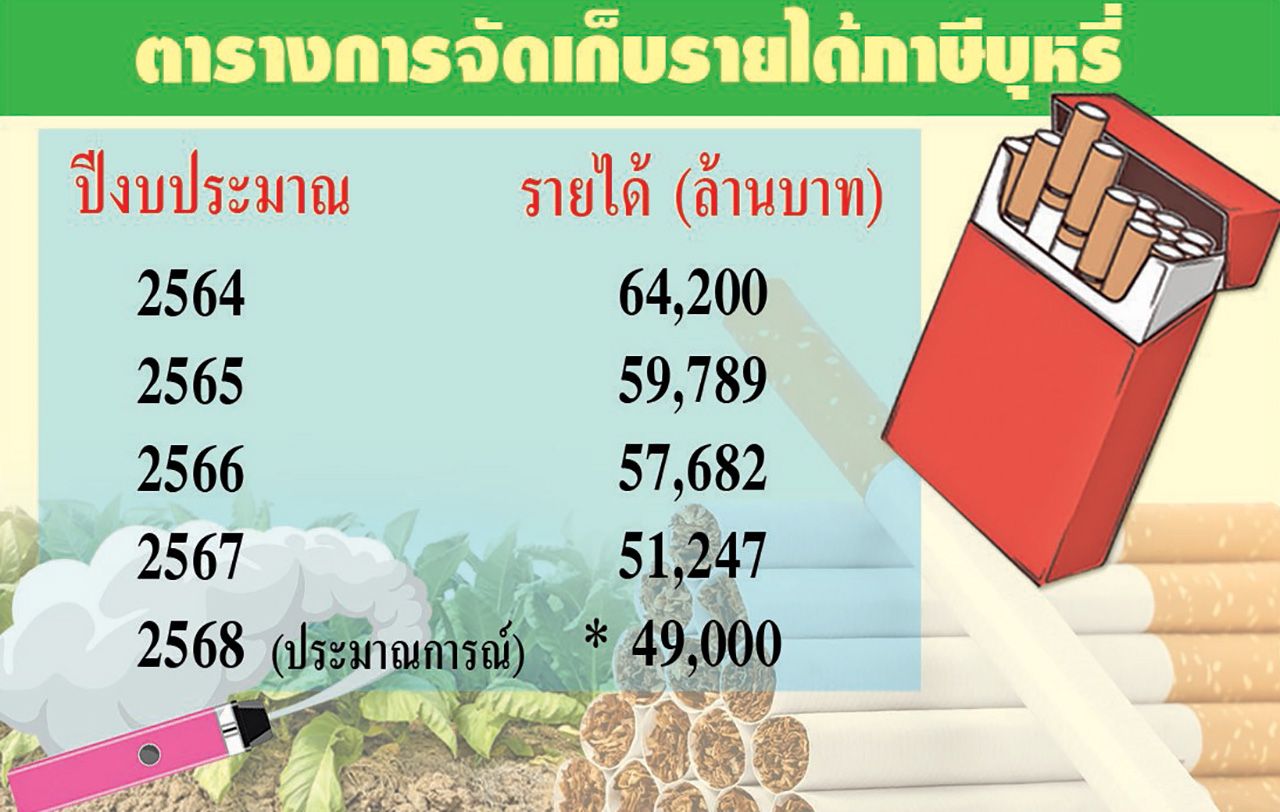 โดยปีงบประมาณ 2564 กรมสรรพสามิตจัดเก็บรายได้ภาษีบุหรี่ 64,200 ล้านบาท ปี 2565 จัดเก็บรายได้ 59,789 ล้านบาท ปี 2566 จัดเก็บรายได้ 57,682 ล้านบาท ปี 2567 จัดเก็บรายได้ 51,247 ล้านบาท และคาดว่าปี 2568 รายได้จะต่ำกว่า 50,000 ล้านบาทอย่างแน่นอน เพราะเพียง 3 เดือนแรกของปีงบประมาณ 68 จัดเก็บได้ 9,517 ล้านบาท ลดลง 24.34% เมื่อเทียบช่วงเดียวกันของปีก่อนจัดเก็บได้ 12,578 ล้านบาท