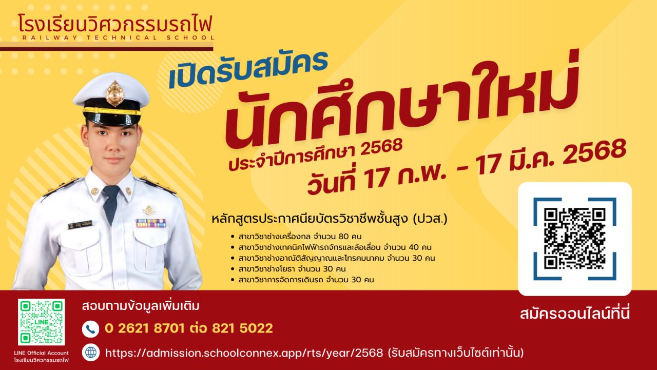 อย่างไรก็ตาม กำหนดวันรับสมัคร ตั้งแต่วันที่ 17 กุมภาพันธ์ 2568 ถึงวันที่ 17 มีนาคม 2568 เวลา 16.00 น. ที่เว็บไซต์ https://admission.schoolconnex.app/rts/year/2568 (รับสมัครทางเว็บไซต์เท่านั้น) ผู้ที่สนใจสามารถดูรายละเอียดเพิ่มเติมที่ เว็บไซต์ โรงเรียนวิศวกรรมรถไฟ หรือ (คลิกที่)
