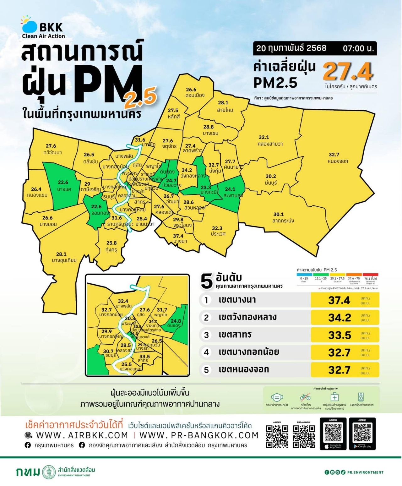 ขณะที่ ศูนย์ข้อมูลคุณภาพอากาศกรุงเทพมหานคร ขอรายงานสถานการณ์ฝุ่น PM2.5 ในกรุงเทพมหานคร เมื่อเวลา 07.00 น. ค่าเฉลี่ยของกรุงเทพมหานคร 27.4 มคก./ลบ.ม. ฝุ่นละอองมีแนวโน้มเพิ่มขึ้น ภาพรวมคุณภาพอากาศอยู่ในเกณฑ์ปานกลาง สีเหลือง ค่าเฉลี่ย 24 ชั่วโมง : ตรวจวัดได้ 17.8-37.3 มคก./ลบ.ม. พบว่าไม่เกินมาตรฐานทุกพื้นที่ที่มีการตรวจวัด (มาตรฐานไม่เกิน 37.5 มคก./ลบ.ม.) โดย 12 อันดับของค่าฝุ่น PM2.5 เขตสูงสุดในกรุงเทพมหานคร มีดังนี้