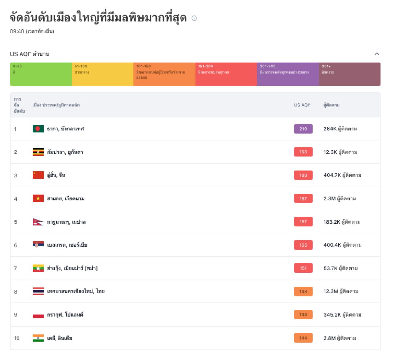 นอกจากนี้ เว็บไซต์ Iqair ยังได้รายงานด้วยว่า เมื่อเวลา 09.40 น. เชียงใหม่ติดเมืองมลพิษอันดับที่ 8 ของโลก โดยอันดับ 1 เป็นของเมืองธากา บังกลาเทศ.