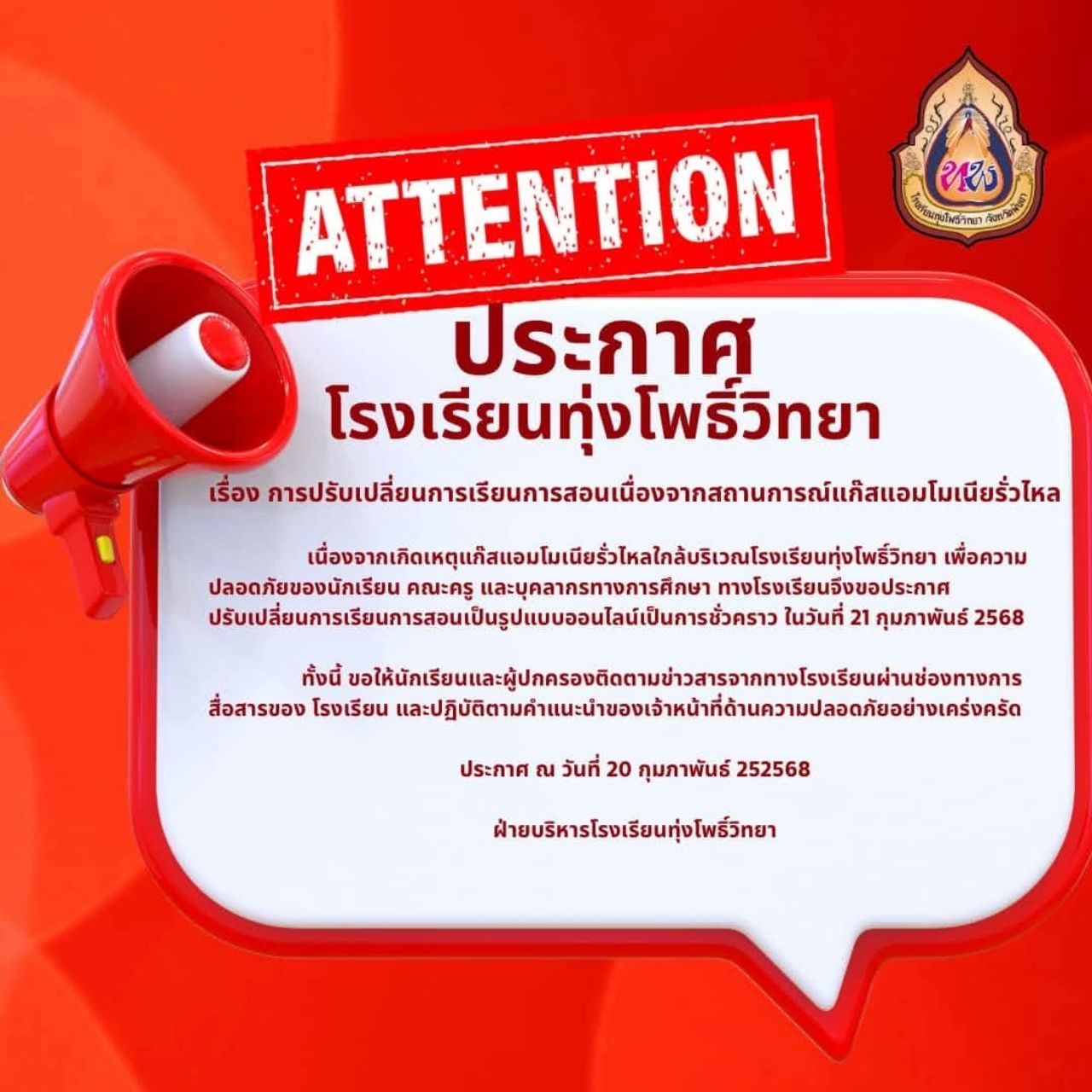 จากเหตุดังกล่าวไม่มีผู้ได้รับบาดเจ็บหรือเสียชีวิต สำหรับสาเหตุอยู่ระหว่างการสอบสวนของเจ้าหน้าที่ตำรวจ ด้านโรงเรียนทุ่งโพธิ์วิทยา ได้ประกาศด่วนให้นักเรียนเรียนทางออนไลน์ในวันศุกร์ ที่ 21 ก.พ. 68 เพื่อหลีกเลี่ยงผลกระทบจากแอมโมเนียดังกล่าว.