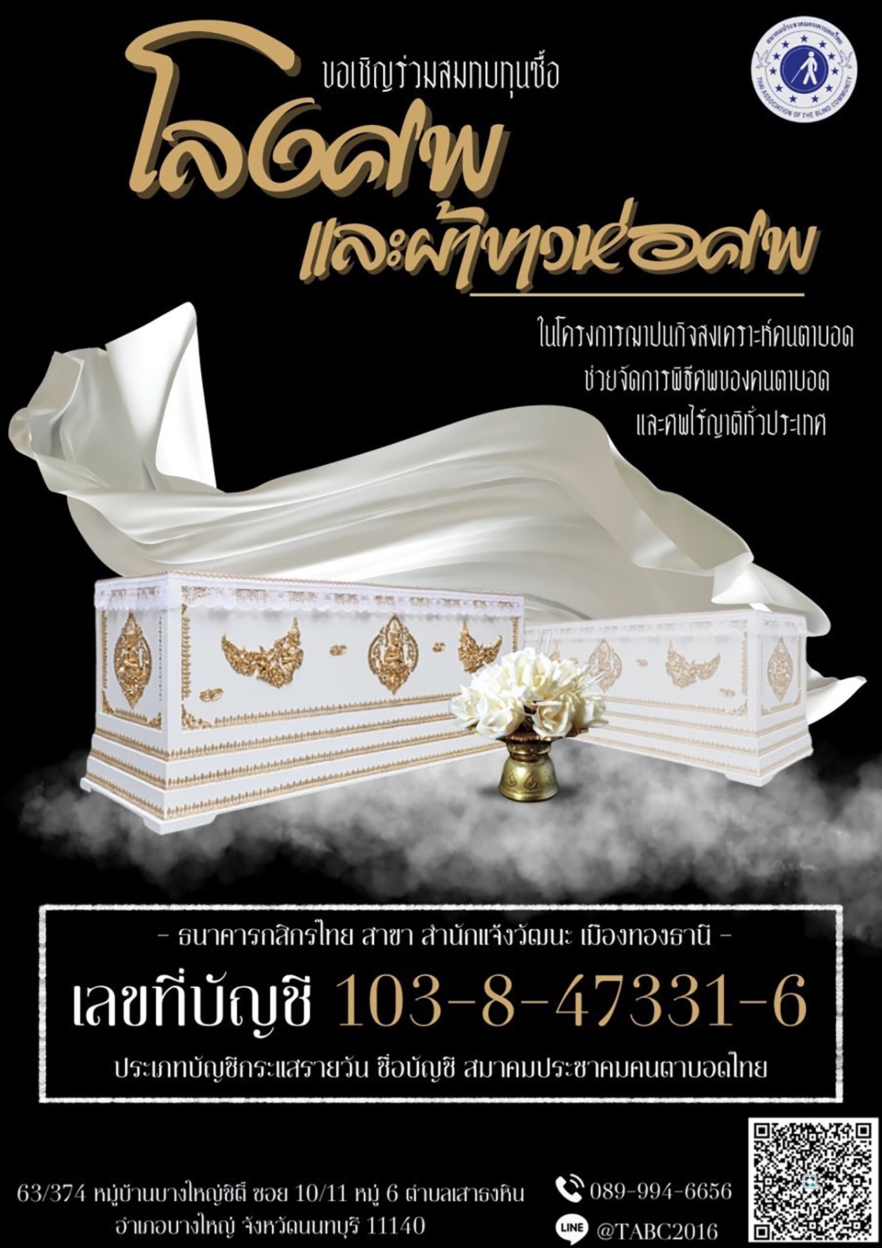 สมาคมประชาคมคนตาบอดไทย จึงขอเชิญชวนผู้มีจิตศรัทธาทุกท่าน เดินทางไปมอบโลงเย็น จำนวน 12 โลง โลงบรรจุศพแบบเทพพนม จำนวน 120 โลง ให้วัดต่างๆ ในจังหวัดปัตตานี จำนวน 12 วัด ประกอบด้วย 1. วัดนพวงศาราม (ธ) 2. วัดมะปริงวารีราม (ธ) 3. วัดหงสาราม (ธ) อ.ปะนาเระ 4. ที่พักสงฆ์แหลมนก (ธ) 5. วัดโพธาราม 6. วัดศรีมหาโพธิ์ 7. วัดมะปรางมัน 8. วัดยานิการาม 9. วัดอัมพวนาราม 10. วัดโชติรส 11. วัดนิคมสถิตย์ และ 12. วัดนาประดู่ โดยกิจกรรมจะจัดขึ้นในวันที่ 4 มีนาคม พ.ศ. 2568 ระหว่างเวลา 13.00 - 14.00 น. ณ วัดนพวงศาราม อ.เมืองปัตตานี จ.ปัตตานี โดยในพิธีจะมีพระสงฆ์ให้ศีลให้พรเจริญพระพุทธมนต์ และพระสงฆ์จะได้ประพรมน้ำพระพุทธมนต์ ให้ผู้เข้าร่วมพิธีทุกท่านเพื่อความเป็นสิริมงคล