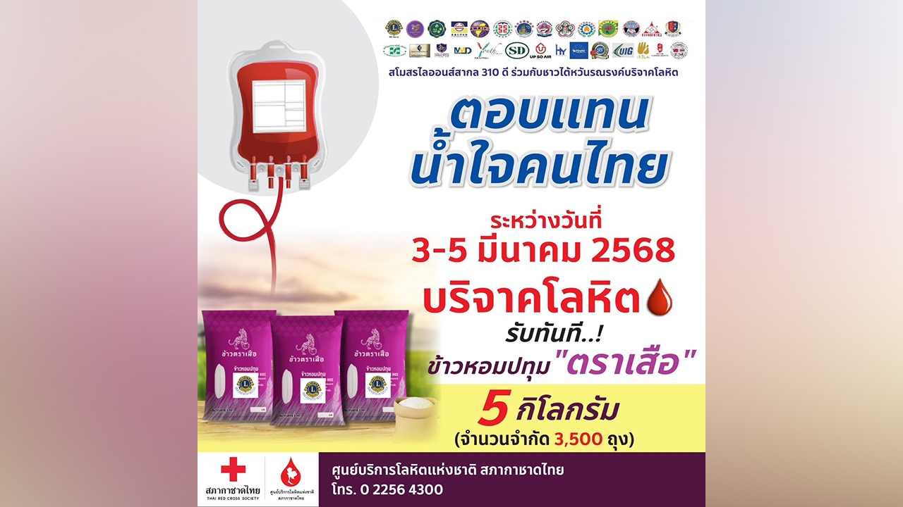 ศูนย์บริการโลหิตแห่งชาติ จึงร่วมกับ สโมสรไลออนส์สากล 310 ดี และกลุ่มชาวไต้หวันรณรงค์ บริจาคโลหิต มอบข้าวหอมปทุม “ตราเสือ” จำนวน 3,500 ถุง ให้กับผู้บริจาคโลหิตที่มีสุขภาพร่างกายแข็งแรง ระหว่างวันที่ 3 – 5 มีนาคม 2568 ณ ศูนย์บริการโลหิตแห่งชาติ สภากาชาดไทย ร่วมบริจาคโลหิตช่วยชีวิตเพื่อนมนุษย์ เพื่อสำรองโลหิตคงคลังให้เพียงพอกับโรงพยาบาลต่าง ๆ ทั่วประเทศ ของที่ระลึกมีจำนวนจำกัด