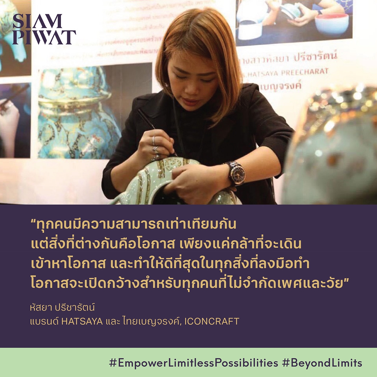 คุณหัสยา ปรีชารัตน์ จากช่างศิลป์สู่ศิลปินระดับโลก ด้วยพลังแห่งความมุ่งมั่นสำหรับงานด้านหัตถกรรม การเป็นศิลปินไทยที่ได้รับการยอมรับในระดับสากล จำเป็นต้องพิสูจน์ตัวเองด้วยผลงานที่มีคุณค่าและความคิดสร้างสรรค์อย่างต่อเนื่อง โดยเฉพาะในวัยที่ยังไม่มาก สิ่งสำคัญคือ Passion ที่ไม่เคยหยุดนิ่ง พร้อมสะท้อนให้เห็นถึงคุณค่าในผลงานและตัวตน ช่างศิลป์เบญจรงค์รุ่นใหม่ที่ได้ผสมผสานงานฝีมือดั้งเดิมเข้ากับงานออกแบบร่วมสมัย การนำเสนองานหัตถกรรมไทยในรูปแบบใหม่ และมีโอกาสสร้างสรรค์สินค้าให้แบรนด์ระดับโลก เส้นทางความสำเร็จของ HATSAYA และไทยเบญจรงค์ เริ่มต้นขึ้นเมื่อสยามพิวรรธน์เปิดโอกาสให้เข้าร่วมเป็นส่วนหนึ่งของไอคอนคราฟต์ ที่ไม่เพียงเป็นพื้นที่วางจำหน่ายสินค้า แต่ยังเป็นแหล่งเรียนรู้ครบวงจร ที่สนับสนุนความรู้ด้านการตลาด การสื่อสาร และการสร้างแบรนด์อย่างแท้จริง