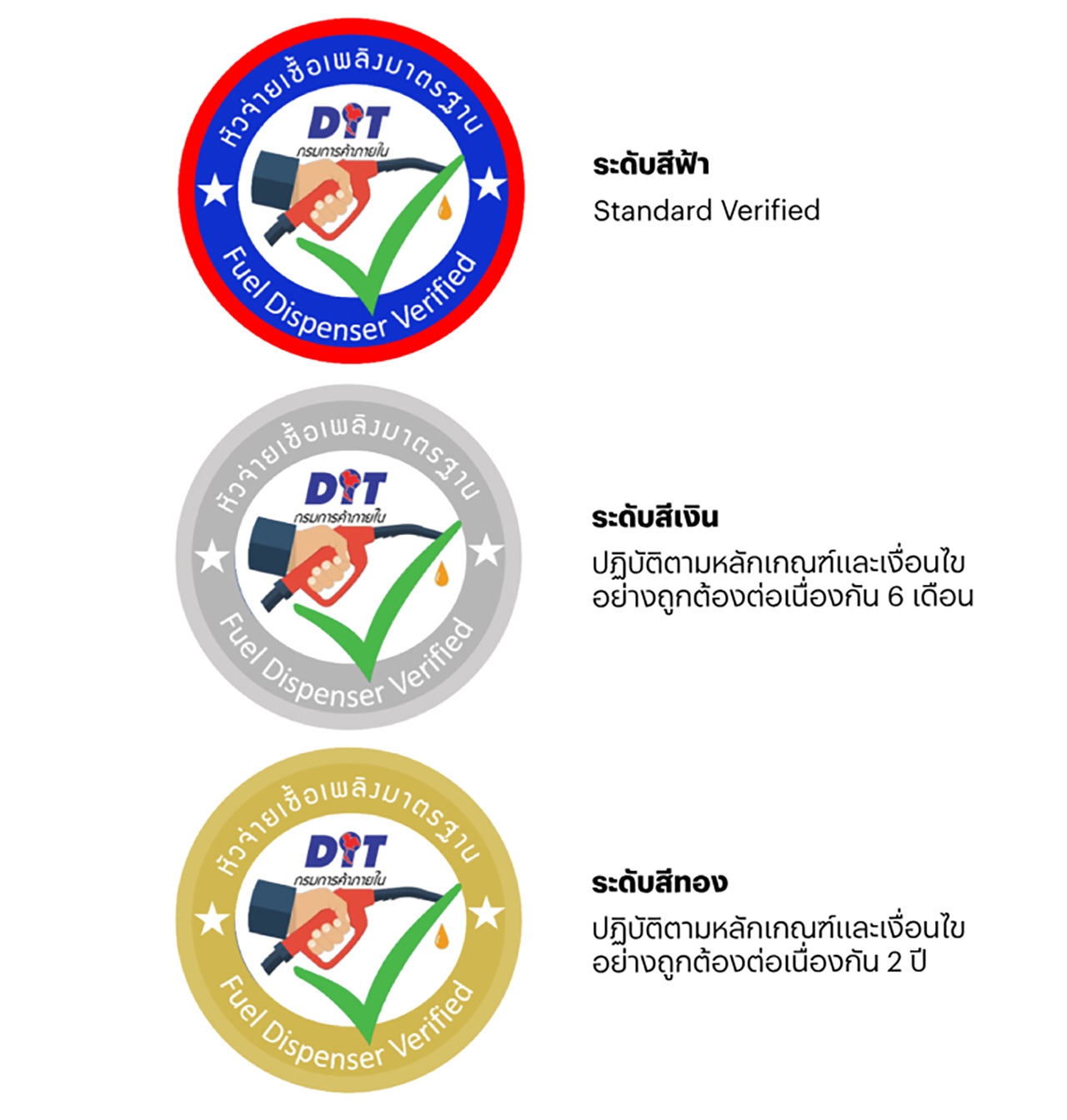 สถานีบริการน้ำมันที่ผ่านเกณฑ์ของกรมการค้าภายในจะได้รับเครื่องหมายรับรอง "โครงการหัวจ่ายเชื้อเพลิงมาตรฐาน" เพื่อให้ประชาชนสามารถมั่นใจได้ว่า หัวจ่ายน้ำมันที่สถานีดังกล่าวได้รับการตรวจสอบและผ่านมาตรฐานตามที่กฎหมายกำหนด โดยมีระดับการรับรองดังนี้