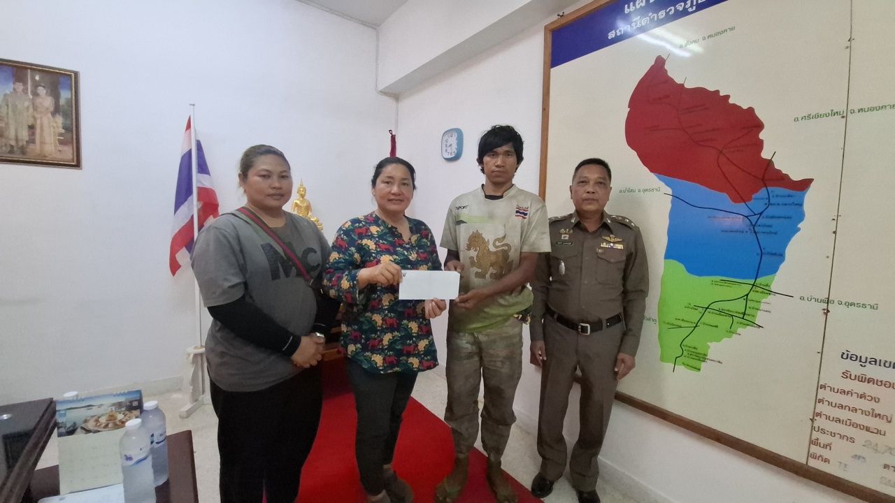จากกรณีนายบุญกอง มั่นเมืองปัก หรือน้ำฝน อายุ 28 ปี อยู่บ้านเลขที่ 90 ม.6 บ.สาครพัฒนา ต.หนองแวง อ.น้ำโสม จ.อุดรธานี ปั่นจักรยานพ่วงรถเข็นเก็บของเก่า เข้ามาแจ้งความว่าเก็บเงินสดเป็นธนบัตร 1,000 บาท ได้ 1 ปึก จำนวน 1 แสนบาท ไม่ทราบว่าเป็นเงินของใคร จึงอยากให้ตำรวจช่วยตามหาเจ้าของ โดยเก็บได้อยู่ริมถนนกลางใหญ่-น้ำโสม หน้า บ.เมืองไทยแคปปิตอล สาขา ต.กลางใหญ่ อ.บ้านผือ จ.อุดรธานี ก่อนตำรวจจะส่งมอบเงินคืนให้กับนางปิยะนุช ศรีทอง หรืออุ๊ อายุ 41 ปี บ้านเลขที่ 101/1 ม.1 ต.กลางใหญ่ อ.บ้านผือ จ.อุดรธานี ขณะขับรถกระบะมากับครอบครัวตามหาเงินที่หล่นหายตรงจุดเกิดเหตุ