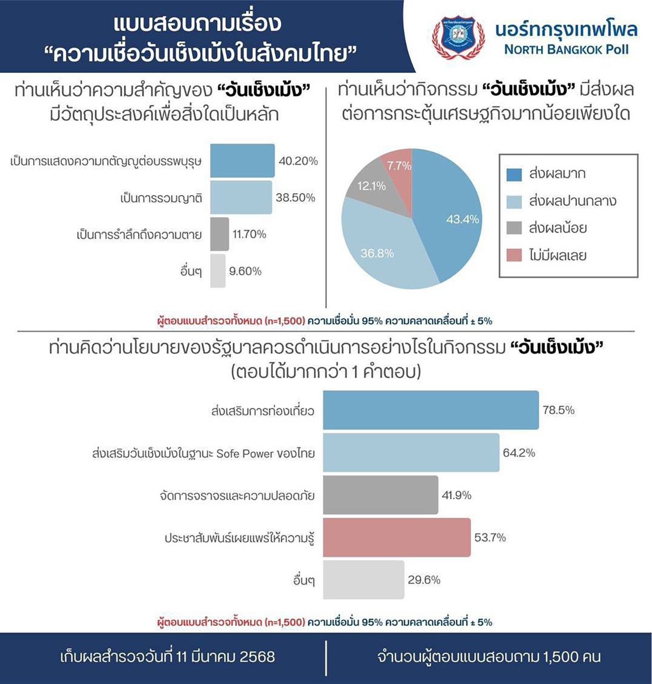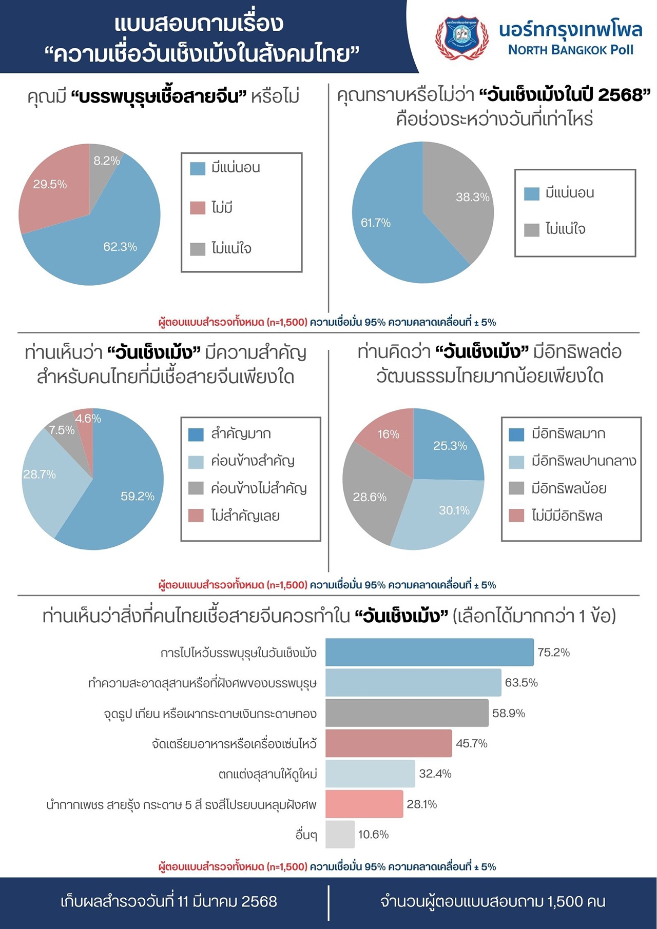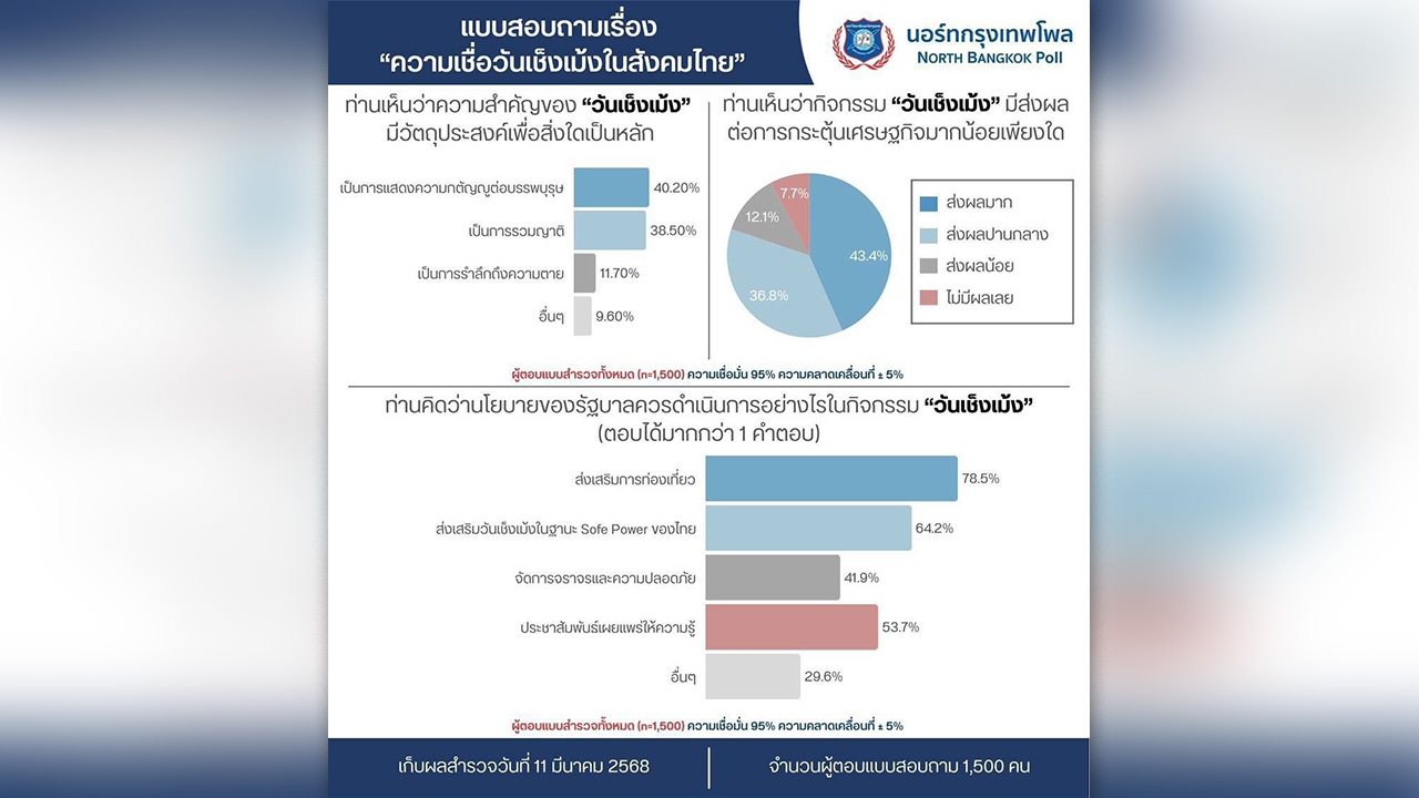 ผศ.ดร.สานิต ศิริวิศิษฐ์กุล ศูนย์สำรวจความคิดเห็น “นอร์ทกรุงเทพโพล” เปิดเผยผลจากการสำรวจความคิดเห็นของประชาชนต่อความเชื่อวันเช็งเม้งในสังคมไทย ในวันที่ 8 -11 มีนาคม 2568 จำนวนตัวอย่าง 1,500 ตัวอย่าง จากประชาชนทุกภูมิภาคทั่วประเทศ ที่ค่าความเชื่อมั่นร้อยละ 95