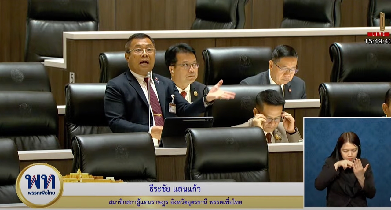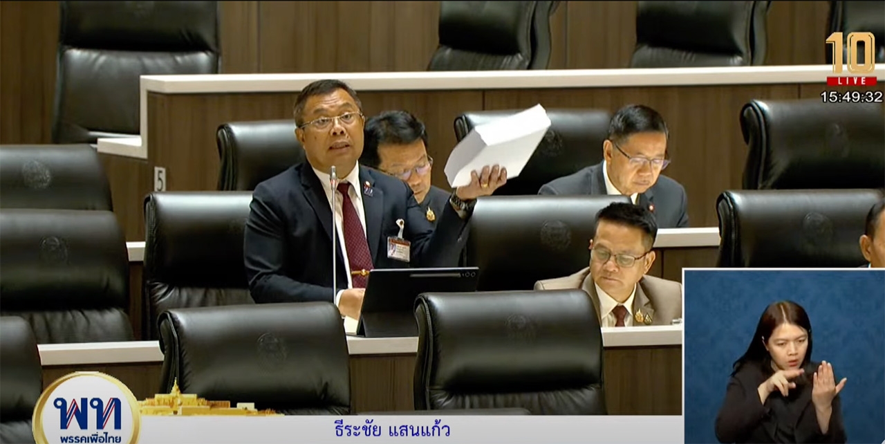 นายธีระชัย แสงแก้ว ส.ส. อุดรธานี พรรคเพื่อไทย อภิปรายว่าทุกวันนี้บุหรี่ไฟฟ้าเป็นปัญหาที่กัดกินสังคมโดยเฉพาะเด็กเยาวชน ซึ่งวิทยาลัยอายุรแพทย์แห่งประเทศไทยระบุว่าการโฆษณาบุหรี่ไฟฟ้ามีการบิดเบือนการเพื่อสร้างภาพลักษณ์ให้บุหรี่ไฟฟ้าเปลี่ยนจากสิ่งเสพติดที่อันตรายให้เป็นทางเลือกในการสูบบุหรี่ ซึ่งเป็นการบิดเบือนทั้งสิ้น แม้แต่แพทย์โรงพยาบาลรามาธิบดีก็ยืนยันหลักฐานทางการแพทย์บุหรี่ไฟฟ้ามีอันตรายมาก บุหรี่ไฟฟ้าจะทำให้คนติดบุหรี่ได้ง่ายเพราะมันสูบง่ายกว่าเดิม มีรสชาติใหม่ มีหลายรสชาติ เด็กสามารถติดใจง่ายขึ้น บุหรี่ไฟฟ้ามันเป็นตัวกระตุ้นให้เยาวชนอยากสูบ ตกอยู่ในภาวะเสี่ยงอันตรายต่อสุขภาพและสมองของเขา ขอชื่นชมรัฐบาลที่มีการปราบปรามกวาดล้างอย่างจริงจัง อย่างไรก็ตามประเทศไทยมีมาตรการทางกฎหมายห้ามนำเข้าและห้ามจำหน่ายบุหรี่ไฟฟ้า แต่ก็ยังพบการแพร่ระบาดการสูบบุหรี่ไฟฟ้ามีแนวโน้มสูงขึ้นในหมู่เด็กและเยาวชน