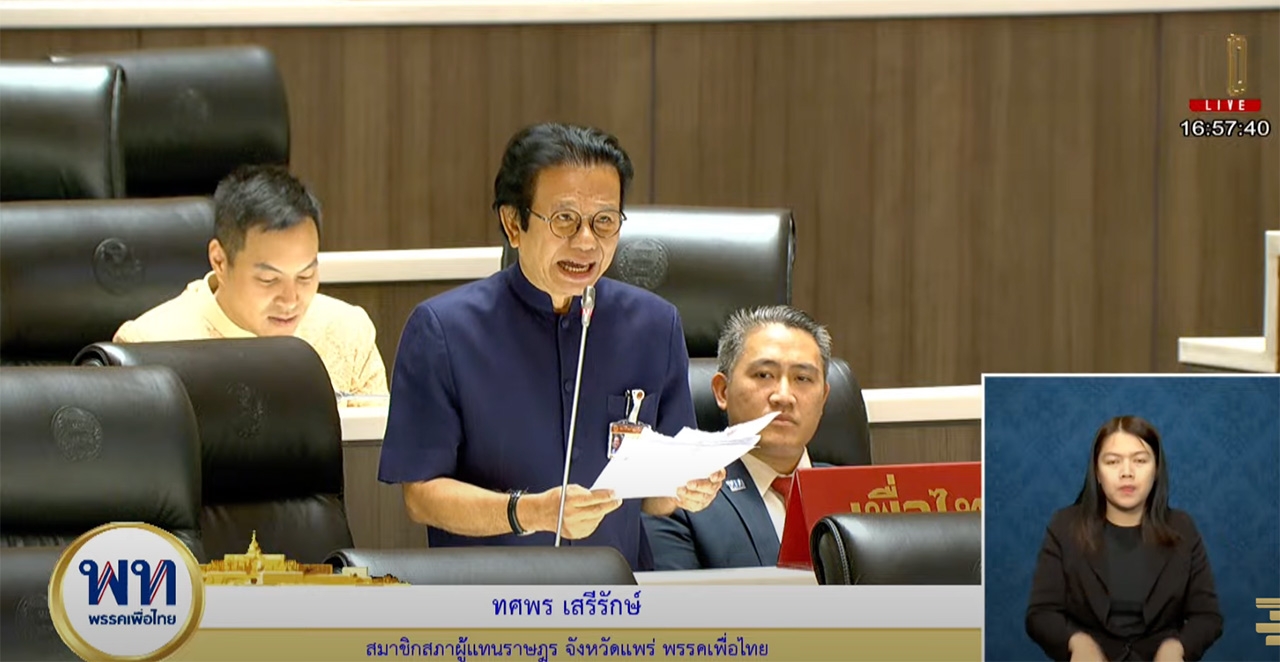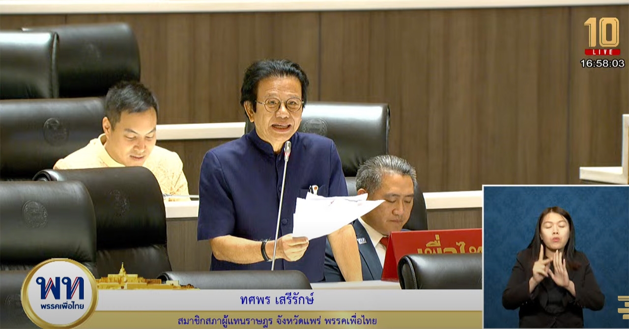 “ในที่ประชุมกรรมาธิการเอง บางคนบ่นว่าทำไมเชิญแต่คนไม่เห็นด้วยกับการบุหรี่ไฟฟ้ามา เชิญแต่หมอ เชิญแต่นักเรียนที่ไม่เห็นด้วย ทำไมไม่เชิญพวกที่เห็นด้วยกับบุหรี่ไฟฟ้ามา เพราะความจริงมันไม่ค่อยมีคนที่เห็นด้วยกับบุหรี่ไฟฟ้าเลย ไปดูการประชุมหลายครั้งคุณหมอทั้งหลายมาพูดถึงโทษถึงความร้ายแรงของบุหรี่ไฟฟ้าก็จะลุกหนีกันหมด ผมข้องใจภาคผนวกในรายงานฉบับนี้ ผมไม่เห็นด้วยกับข้อเสนอแนะ ถ้าไปอ่านให้ดีแนวทางที่ 2 และ 3 มันจะชักจูงประชาชนให้เข้าใจผิด คือบอกว่ายาสูบแบบให้ความร้อนเป็นสิ่งที่ถูกควบคุมตามกฎหมาย เป็นการใช้วาจาซ่อนเร้น พูดจริงๆ ก็คือจะบอกว่าจะทำให้มันถูกกฎหมายนั่นแหละ ใช้คำว่าถูกควบคุมตามกฎหมาย แสดงว่าต่อไปนี้จะออกกฎหมายให้ถูกกฎหมายแล้ว ผมอยากถามว่าคนที่เห็นด้วยกับแนวทางให้บุหรี่มันถูกกฎหมายเป็นทาสที่สูบบุหรี่หรือเปล่า เป็นคนสูบบุหรี่ไฟฟ้าหรือเปล่า กรรมาธิการฯ กี่คนที่มีความสัมพันธ์กับอาชีพยาสูบ หรือปลูกยาสูบหรือเปล่า หรือเกี่ยวข้องกับชาวไร่ยาสูบอย่างไร มีหมอในกรรมาธิการฯ 6 คนไม่เห็นด้วยกับแนวทางที่ 2 และ 3 เลย ผมฝากไปยังรัฐบาล เรามีอยู่ทางรอดเดียว ต้องไม่ให้บุหรี่ไฟฟ้าขึ้นมาถูกกฎหมาย มีแต่จะต้องเข้มงวดกับกฎหมายที่มีอยู่ หรือออกกฎหมายที่เข้มงวดกับบุหรี่ไฟฟ้ามากขึ้น ทุกวันนี้เด็กไทยเกิดน้อยอยู่แล้วเราต้องป้องกันให้ลูกหลานของเราพ้นภัย อย่าให้มีบุหรี่ไฟฟ้ามาทำร้ายเด็กไทย ทางรอดของเด็กไทยมีอย่างเดียวเราต้อง “แบนบุหรี่ไฟฟ้า” ขอบคุณครับ” นายแพทย์ทศพรกล่าวย้ำ