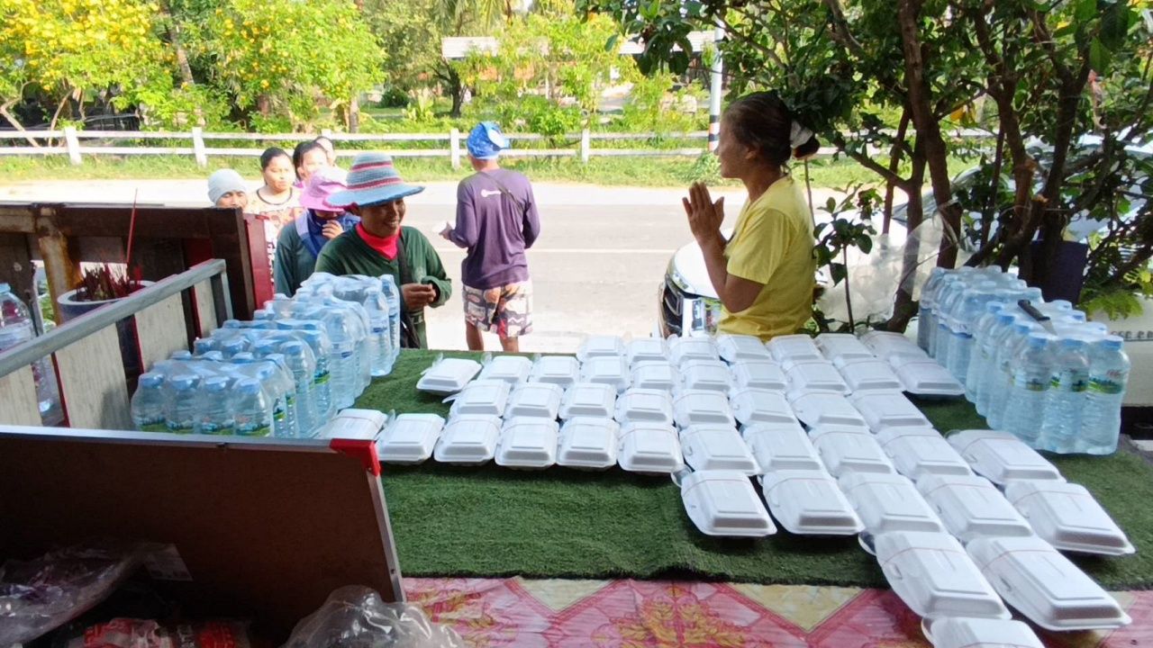 จนกระทั่งถึงทุกวันนี้ เป็นระยะ 4 ปีเต็ม ก็ยังจัดทำข้าวกล่องแจกพร้อมกับน้ำดื่มทุกวัน แต่จะหยุดจัดเตรียมของอาทิตย์ละ 1 วัน คือวันอาทิตย์ โดยวัตถุดิบทำข้าวกล่องจะซื้อวันต่อวัน ส่วนไหนหมดก็จะซื้อเพิ่มเติมมาทำต่อ ซึ่งก็จะเป็นเมนูอาหารหลักไม่ซ้ำ ตักใส่กล่องราดข้าวทานได้เลย หลังจากตักบาตรพระเสร็จตอนเช้าก็จะเริ่มแจกจ่าย ทำให้แต่ละวัน ก็จะมีชาวบ้าน แรงงาน คนหาเช้ากินค่ำ ผู้ยากไร้ ผู้มีรายได้น้อย แวะเวียนมารับข้าวกล่องไปทาน