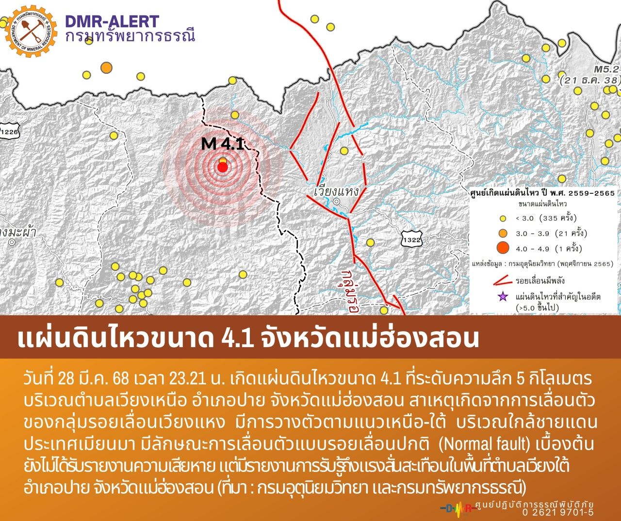 วันที่ 28 มี.ค. 2568 เวลา 23.21 น. มีรายงานว่า เกิดแผ่นดินไหวขนาด 4.1 ที่ระดับความลึก 5 กิโลเมตร บริเวณตำบลเวียงเหนือ อำเภอปาย จังหวัดแม่ฮ่องสอน