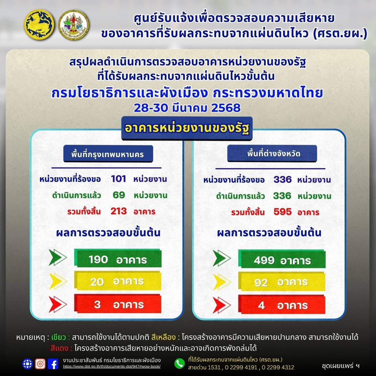 สรุปผลการตรวจสอบอาคารที่มีการแจ้งว่าได้รับความเสียหาย ตั้งแต่วันที่ 28–30 มีนาคม 2568 ทั้งในกรุงเทพมหานคร และต่างจังหวัด รวมทั้งสิ้น จำนวน 808 อาคาร นอกจากนี้ กรมโยธาธิการและผังเมืองมีช่องทางให้เจ้าของอาคาร ผู้ตรวจสอบอาคาร หรือพี่น้องประชาชน สามารถรับทราบข้อมูลต่าง ๆ ผ่านช่องทางการประชาสัมพันธ์ของกรมฯ สื่อมวลชน โทรทัศน์ วิทยุ หนังสือพิมพ์ และสื่อออนไลน์