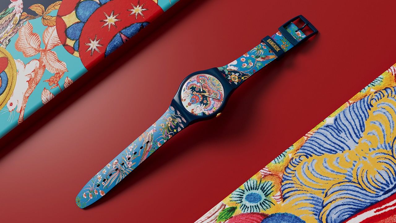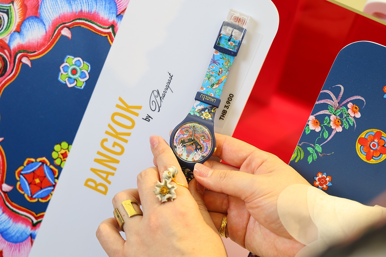 และเพื่อเป็นการเฉลิมฉลองร้านสาขาใหญ่ที่สุดในโลก ในกรุงเทพมหานคร อีกหนึ่งไฮไลต์ของงานคือการเปิดตัวนาฬิกา Swatch Destination Art Bangkok รุ่น THE WANDERER ซึ่งออกแบบโดยไทยดีไซเนอร์ ยูน-ปัณพัท เตชเมธากุล ด้วยแรงบันดาลใจจาก ‘หนุมาน’ ตัวละครเอกจากเรื่องรามเกียรติ์ ไปจนถึงลายไทยอันวิจิตรบรรจง และยังได้แรงบันดาลใจจากความนิยมในการพกเครื่องรางของสังคมไทย โดยหนุมานนั้นขึ้นชื่อว่ามีอำนาจในการคุ้มครอง ทั้งยังจงรักภักดีไม่มีสั่นคลอน ซึ่งเป็นหัวใจการออกแบบของผลงานชิ้นนี้ นอกจากงานศิลป์ลวดลายดาวและเดือนจากลายไทยประจำยามอันงดงามชวนฝันแล้ว นาฬิกาสีสันสดใสเรือนนี้จะทำหน้าที่เป็นเครื่องรางที่คอยปัดเป่าพลังงานลบอีกด้วย นาฬิการุ่นนี้จะเป็นสื่อกลางชวนคิดถึงมรดกทางวัฒนธรรมอันงดงามของไทย ซึ่งเชิดชูความมีชีวิตชีวาและความสนุกสนานของเมืองหลวงของไทย