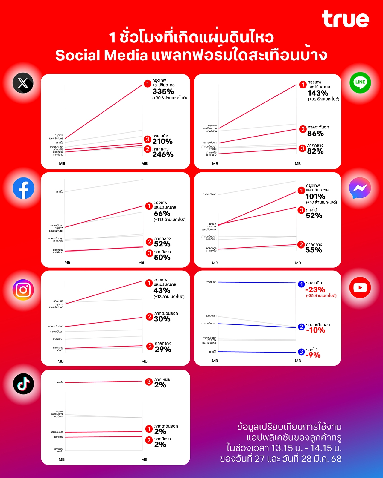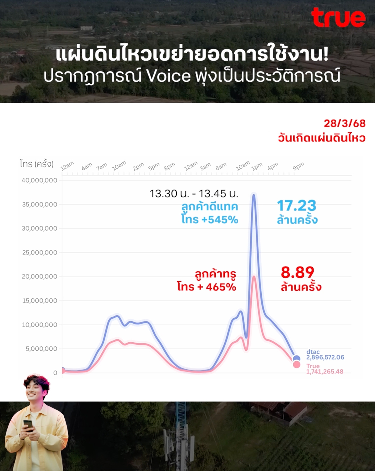 เมื่อวันที่ 28 มีนาคม 2568 เวลาประมาณ 13.25 น. ประเทศไทยรับรู้แรงสั่นสะเทือนจากเหตุแผ่นดินไหว ซึ่งสามารถรู้สึกได้ในหลายพื้นที่ของกรุงเทพมหานครและจังหวัดใกล้เคียง ภายในเวลาไม่ถึง 5 นาที พฤติกรรมการสื่อสารของผู้ใช้งานบนเครือข่ายทรูและดีแทคเปลี่ยนแปลงอย่างฉับพลัน โดยปริมาณการโทรออก (Voice Call) พุ่งสูงเฉลี่ยกว่า 5 เท่า ขณะเดียวกัน การใช้งานดาต้า (Data) ก็เปลี่ยนทิศทางอย่างเห็นได้ชัด