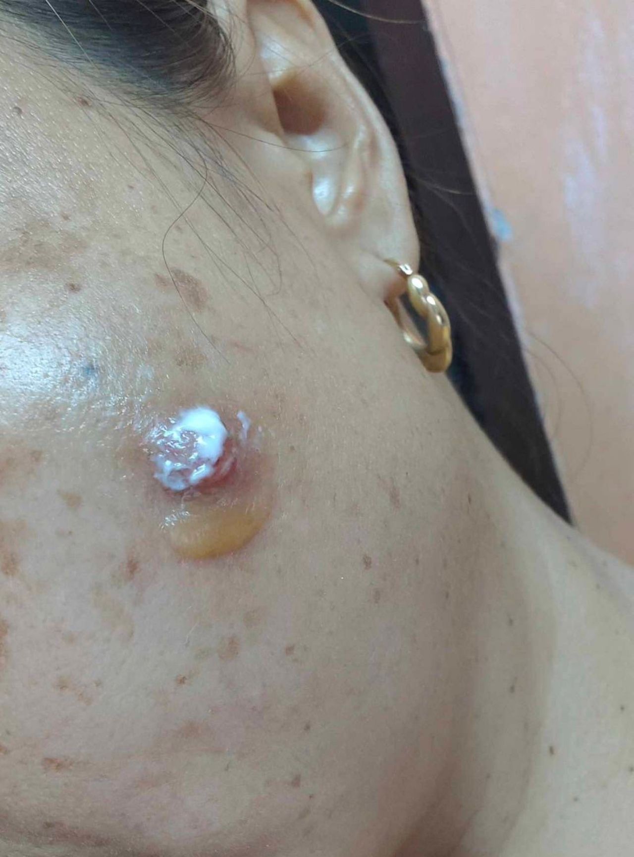 ล่าสุด วานนี้ (2 เม.ย. 68) ผู้ป่วยคนดังกล่าวได้ส่งคลิปวิดีโอมาให้ตรวจสอบด้วยความตกใจ นอกจากบริเวณก้อนเนื้อได้มีแผลปูดออกมา จากนั้นมีตัวพยาธิออกมาด้วย ผู้ป่วยจึงดึงออกมาดูมีความยาวประมาณ 5 เซนติเมตร มีลักษณะเป็นเส้นใสสีขาว จึงได้ถ่ายคลิปแล้วส่งให้ตรวจสอบ
