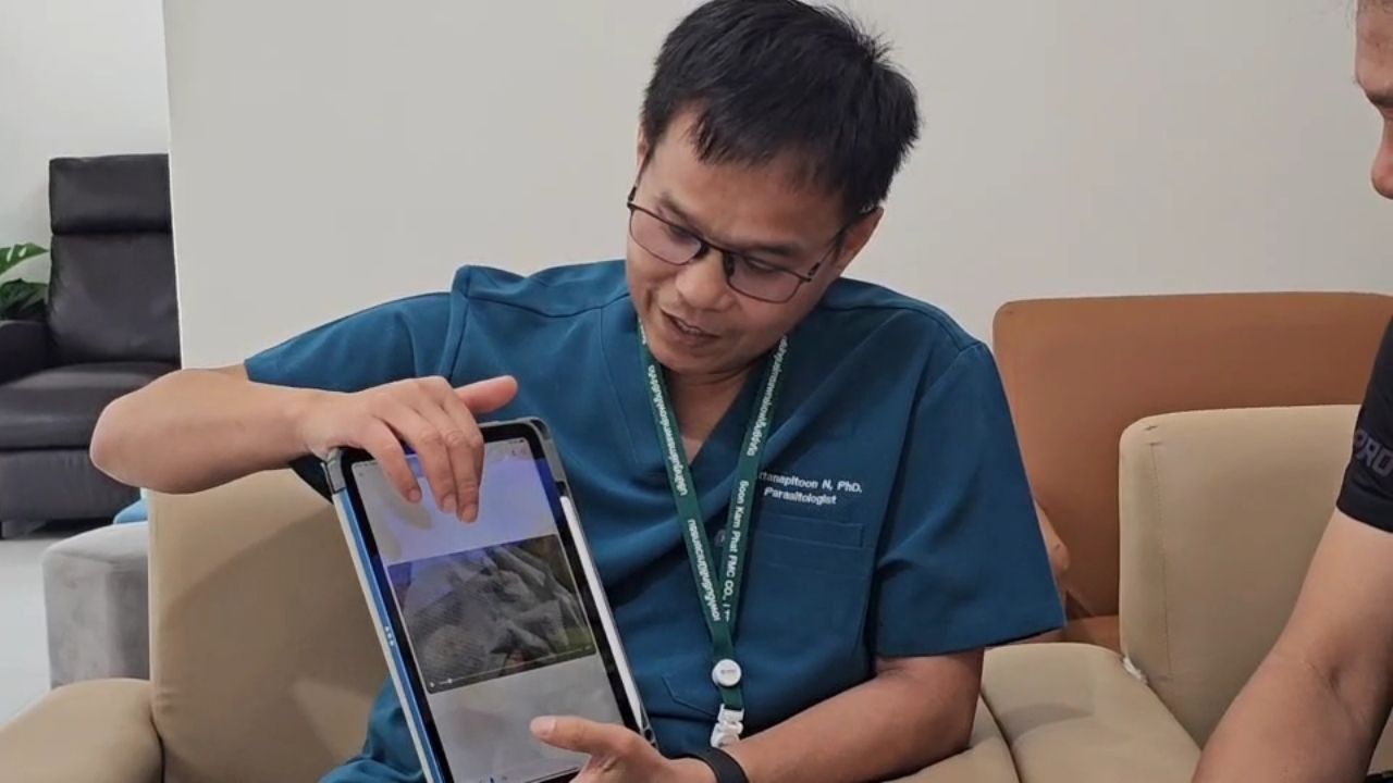 ผู้สื่อข่าวจึงเดินทางไปที่ เอฟเอ็มซีคลินิกเวชกรรม เพื่อไปสอบถามถึงคลิปเหตุการณ์ดังกล่าว โดย ผศ.ดร.ณัธคพัชฬ รัตนพิทูลย์ ที่ปรึกษา ศูนย์วิจัยโรคปรสิต สำนักวิชาแพทย์ มหาวิทยาลัยเทคโนโลยีสุรนารี และผู้จัดการศูนย์การแพทย์เอฟเอ็มซี ผู้โพสต์คลิป เปิดเผยว่า มีผู้ป่วยหญิงวัยกลางคน 1 รายจากจังหวัดระยองได้ติดต่อสอบถามมาตั้งแต่ช่วงปลายเดือนธันวาคม 2567 เกี่ยวกับอาการคันและเจ็บบริเวณรอบดวงตา จึงได้แนะนำให้ไปตรวจกับแพทย์ในพื้นที่วินิจฉัยว่าเป็นพยาธิตัวจี๊ด ได้ยาถ่ายพยาธิรับประทานประมาณ 21 วัน แต่อาการไม่ดีขึ้น