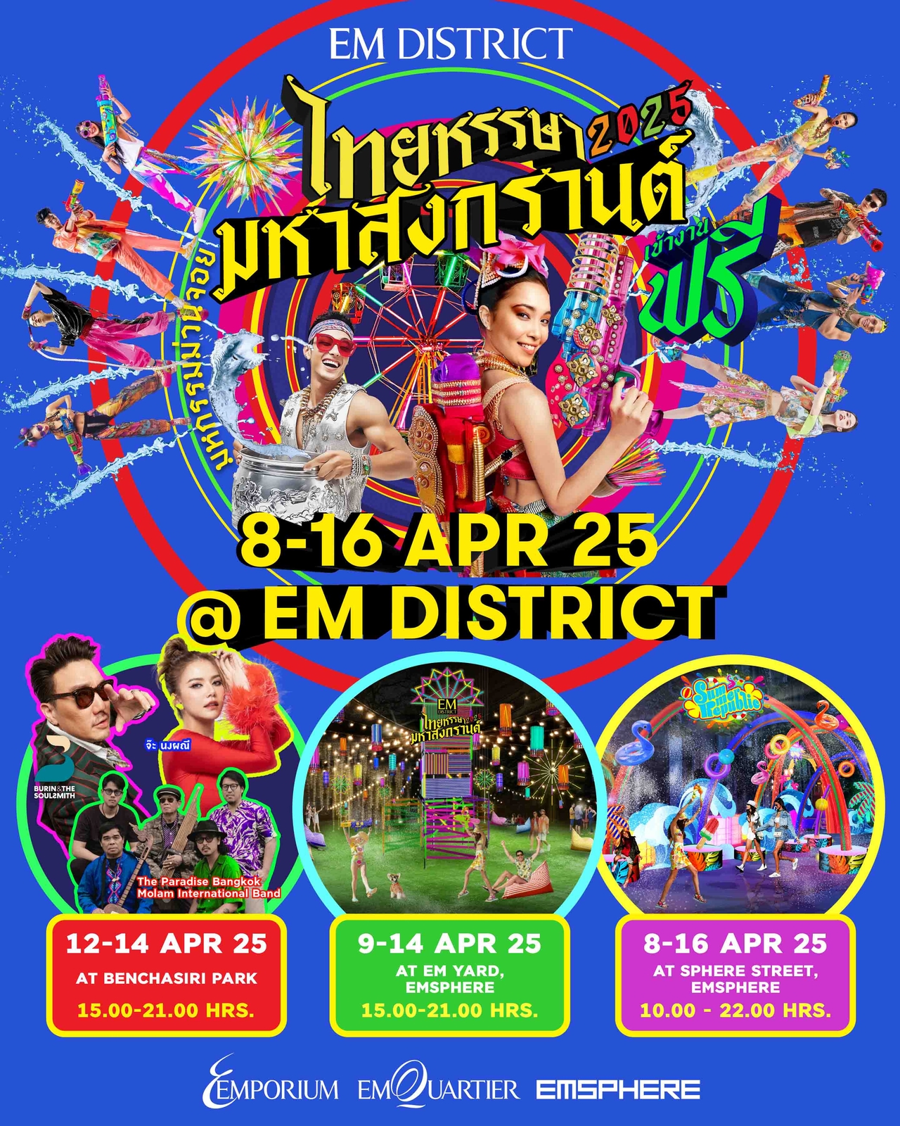 เอ็ม ดิสทริค โดยศูนย์การค้าเอ็มโพเรียม เอ็มควอเทียร์ และเอ็มสเฟียร์ จับมือกระทรวงวัฒนธรรม กรุงเทพมหานคร การท่องเที่ยวแห่งประเทศไทย และเครือข่ายภาคเอกชน สืบสานประเพณีสงกรานต์ของไทยร่วมจัดงาน “เอ็ม ดิสทริค ไทยหรรษา มหาสงกรานต์ 2025” ตั้งแต่วันนี้ - 14 เมษายน 2568 ที่อุทยานเบญจสิริ ปักหมุดแลนด์มาร์กสงกรานต์สุดยิ่งใหญ่ครั้งแรกใจกลางสุขุมวิท ชวนเล่นน้ำสงกรานต์ และสนุกสนานกับกิจกรรมบันเทิงสไตล์ไทยมากมาย พร้อมชวนทุกคนเล่นน้ำชุ่มฉ่ำดับร้อนกับอุโมงค์น้ำความยาว 50 เมตร ที่มาพร้อมแสงสีและเสียงดนตรีจากดีเจชั้นนำ และกิจกรรมฉลองซัมเมอร์ระดับเวิลด์คลาสมากมาย พร้อมกิจกรรมสนุกสนานตลอดเดือนเมษายน 2568