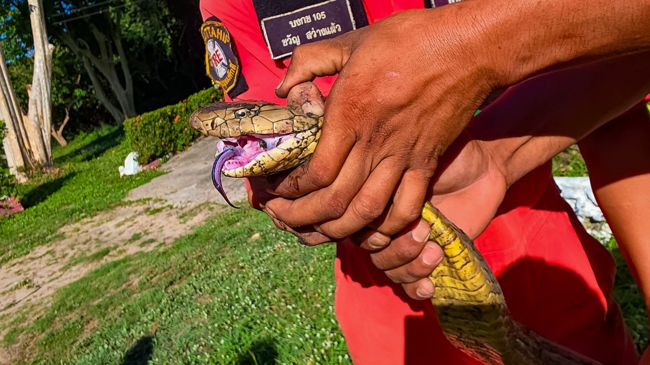 ทั้งนี้ เบื้องต้นเจ้าหน้าที่ได้ใช้อุปกรณ์จับอสรพิษ ชนิดห่วงเชือกและไม้คีบ พยายามเข้าทำการจับ แต่งูได้พยายามหลบหนี พุ่งตัวออกมาจากเครื่องซักผ้า ทำเอาเจ้าหน้าที่ถึงกับวงแตกกระเจิงไปคนละทิศทาง แต่ก็สามารถจับตัวไว้ได้ในที่สุด ขณะพยายามหลบหนีลงท่อระบายน้ำ