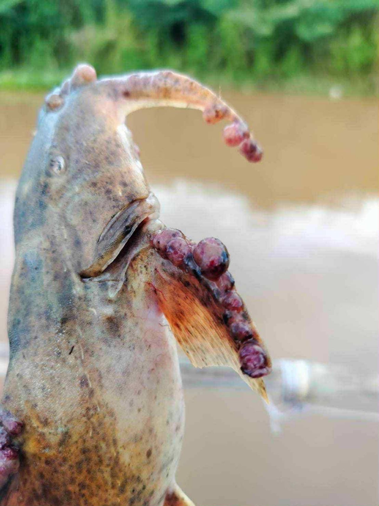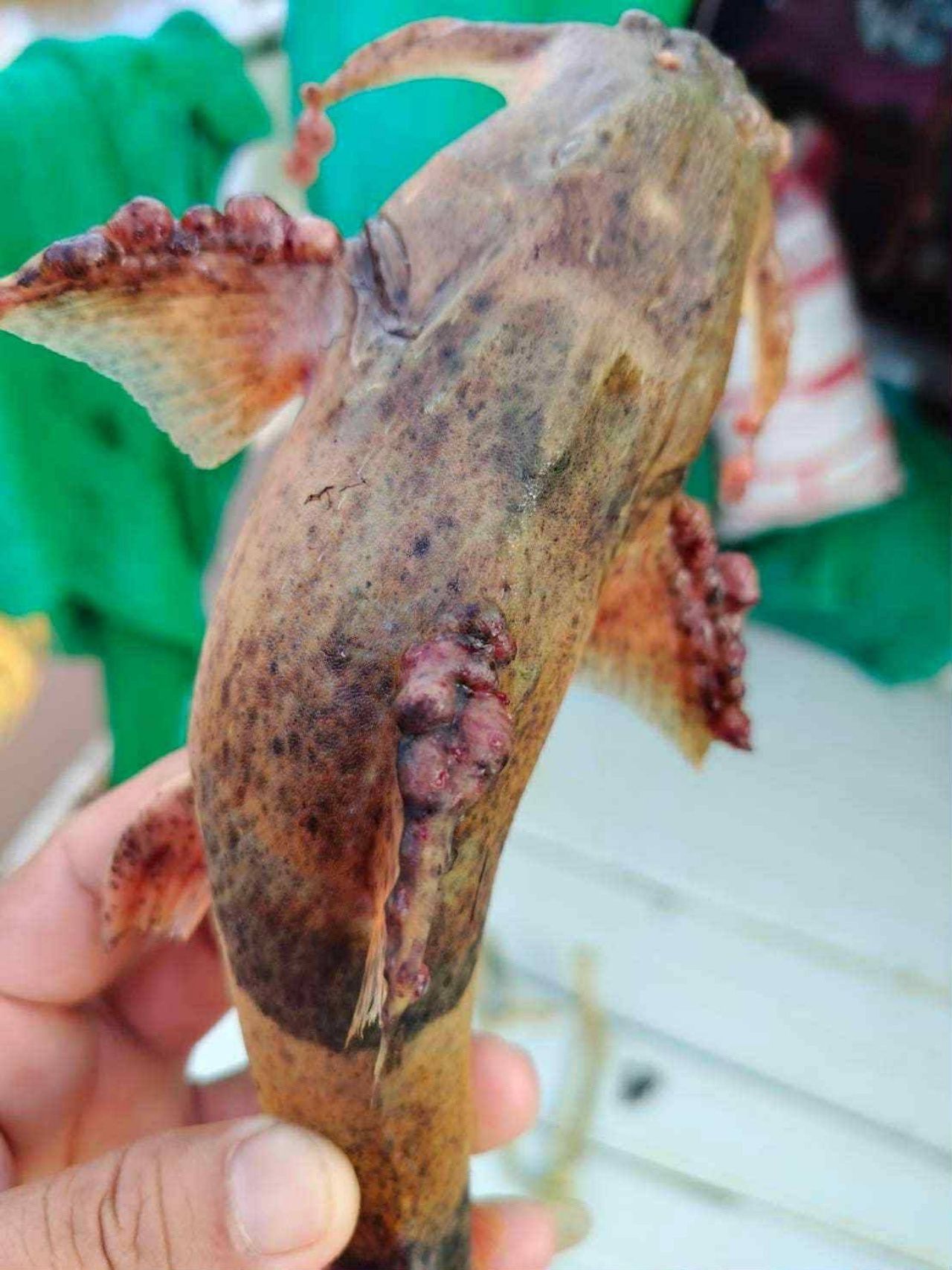 จากลักษณะที่พบ ปลาตัวดังกล่าวมีตุ่มหรือก้อนเนื้อคล้ายดอกกะหล่ำปรากฏบนครีบและลำตัวของปลา มีลักษณะสีแดงอมม่วง ซึ่งจากการประเมินเบื้องต้นคาดว่าอาการดังกล่าวเกิดจากการติดเชื้อไวรัสในกลุ่ม Iridoviridae สกุล Lymphocystivirus เกิดจากสภาพแวดล้อมที่ไม่เหมาะสมก่อให้เกิดความเครียด การเปลี่ยนแปลงอุณหภูมิ หรือการเปลี่ยนแปลงของสภาพภูมิอากาศ ทำให้ปลาอ่อนแอ และง่ายต่อการติดเชื้อ
