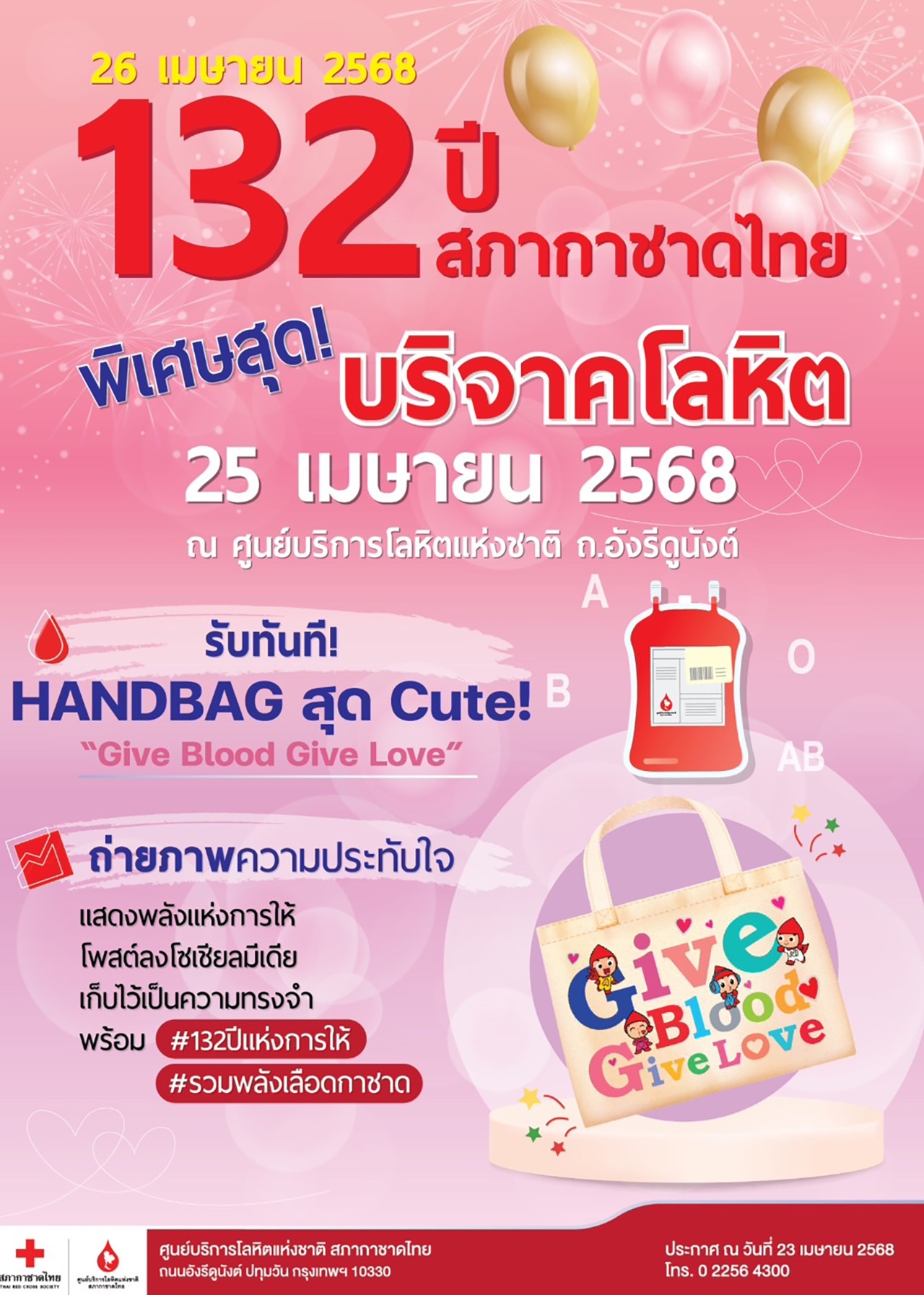 ในโอกาสครบรอบ 132 ปี วันสถาปนาสภากาชาดไทย 26 เมษายน 2568 ศูนย์บริการโลหิตแห่งชาติ จึงขอเชิญชวนคนไทยทั้งประเทศ ร่วมสานต่อพลังแห่งการให้ด้วยการบริจาคโลหิต และร่วมกิจกรรมโพสต์ภาพถ่ายที่แสดงถึงพลังแห่งการให้โลหิต ผ่านโซเชียลมีเดียทุกช่องทาง โดยติดแฮชแท็ก #132ปีแห่งการให้ #รวมพลังเลือดกาชาด เพื่อปลุกกระแสการบริจาคโลหิตช่วยเหลือชีวิตผู้ป่วยพร้อมกันทั่วประเทศ บริจาคโลหิตได้ที่