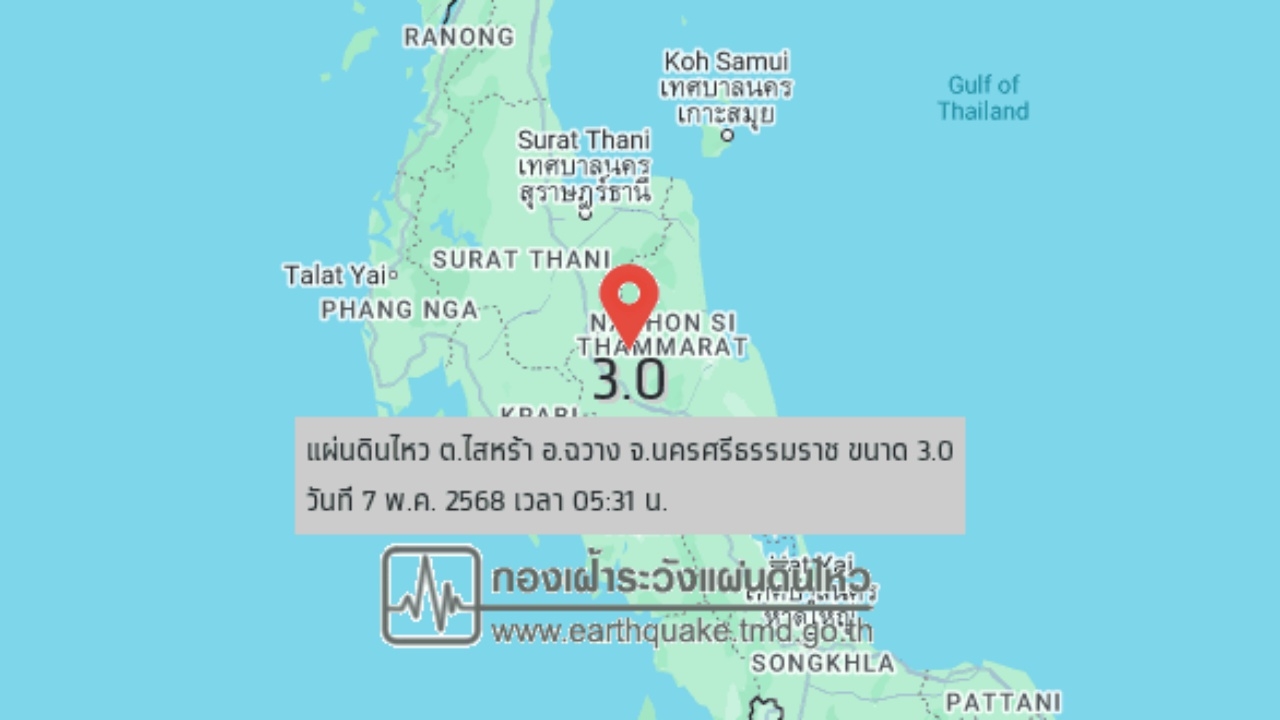 เมื่อเวลา 05.31 น. วันที่ 7 พฤษภาคม 2568 กองเฝ้าระวังแผ่นดินไหว กรมอุตุนิยมวิทยา รายงานการเกิดแผ่นดินไหวบนบก ขนาด 3.0 ความลึก 1 กิโลเมตร บริเวณ ต.ไสหร้า อ.ฉวาง จ.นครศรีธรรมราช พิกัด 8.448N,99.56E ทางทิศตะวันออกเฉียงเหนือของ อ.เมือง จ.กระบี่ ประมาณ 82 กิโลเมตร