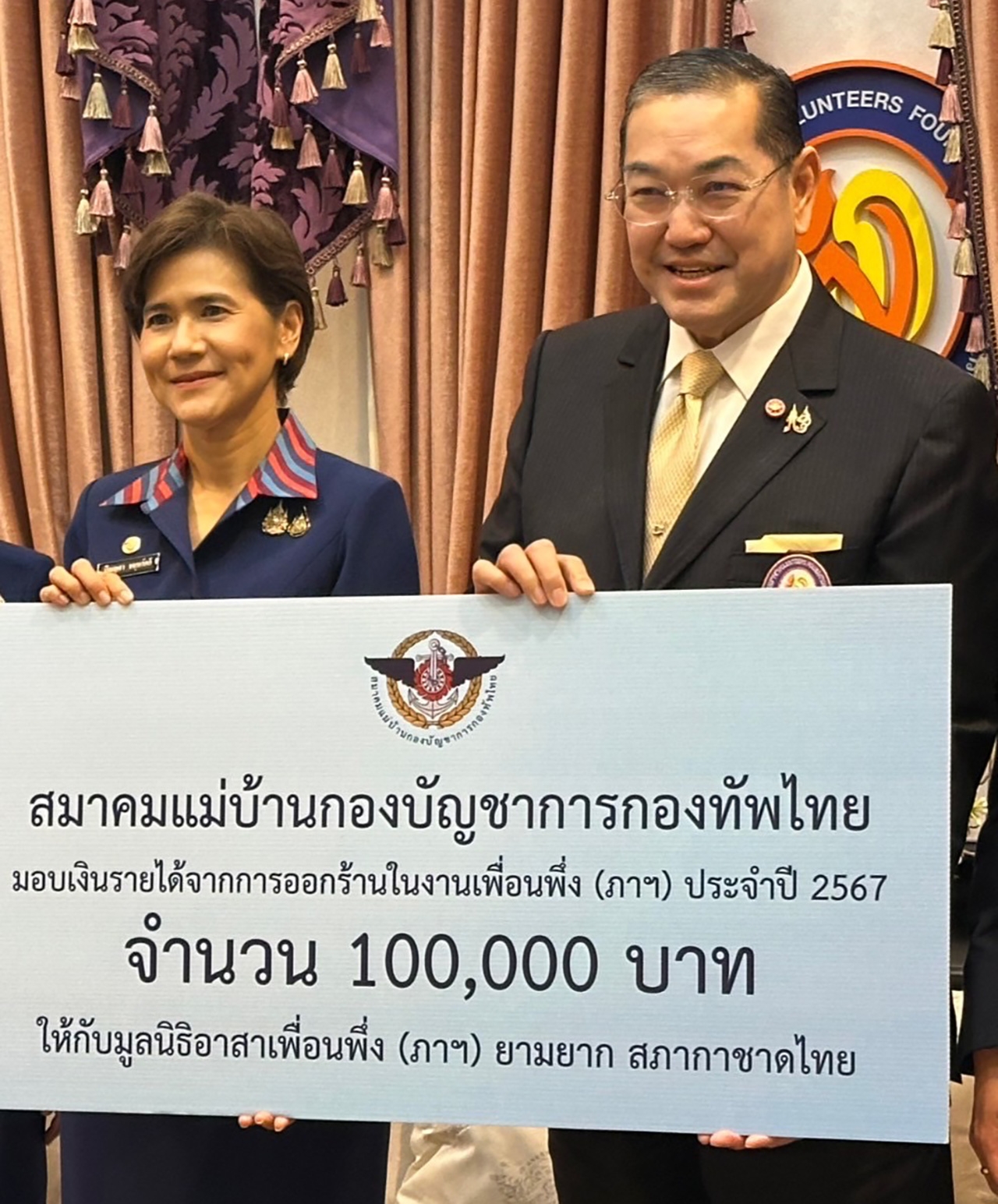 สมาคมแม่บ้านกองบัญชาการกองทัพไทย นำโดย คุณปัญญดา หนุนภักดี นายกสมาคมฯ พร้อมคณะเข้ามอบเงินรายได้จากการออกร้านในงานเพื่อนพึ่ง (ภาฯ) ประจำปี 2567 จำนวน 100,000 บาท เพื่อสมทบทุนมูลนิธิอาสาเพื่อนพึ่ง (ภาฯ) ยามยาก สภากาชาดไทย ในการช่วยเหลือผู้ประสบอุทกภัย โดยมี ศาสตราจารย์พิเศษ ดร.สุรเกียรติ์ เสถียรไทย รองประธานกรรมการที่ปรึกษาและประธานกรรมการบริหาร มูลนิธิอาสาเพื่อนพึ่ง (ภาฯ) ยามยาก สภากาชาดไทย เป็นผู้รับมอบ ณ อาคารมหินทรเดชานุวัฒน์ สำนักงานมูลนิธิฯ