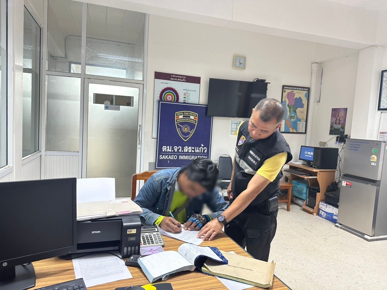 ซึ่งเมื่อเจ้าหน้าที่ ตม.สระแก้ว เดินทางไปถึงหน้าร้านจำหน่ายอุปกรณ์การแพทย์ ถนนราษฎร์อุทิศฯ ได้พบชายชาวกัมพูชา จำนวน 3 คน กำลังทำงานใช้ตู้เชื่อมไฟฟ้า และสว่านไฟฟ้า ติดตั้งกันสาดหลังคาผ้าใบอยู่ที่หน้าร้านดังกล่าว เมื่อเจ้าหน้าที่เข้าไปตรวจสอบ พบมีนายเชอ ชูต อายุ 37 ปี ชาวกัมพูชา แสดงตนเป็นนายจ้างและผู้รับเหมา และมีแรงงานกัมพูชาเป็นช่างเชื่อมอีก 2 คน ชื่อ นายแซมบอง กริม อายุ 20 ปี และนายฟอร์ แฮม อายุ 35 ปี ซึ่งชาวเขมรทั้ง 3 คน มีเพียงหนังสือเดินทางท้องถิ่นกัมพูชา (บอเดอร์พาสกัมพูชา) ซึ่งสามารถเดินทางเข้ามาท่องเที่ยวในประเทศไทยได้ครั้งละ 7 วันเท่านั้น โดยไม่มีเอกสารอนุญาตทำงานในประเทศไทยแต่อย่างใด