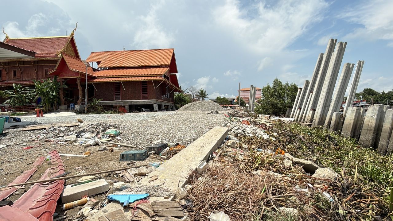 เมื่อเวลา 13.00 น. วันที่ 20 พฤษภาคม 2568 ผู้สื่อข่าวได้ลงพื้นที่ไปยังวัดสร่างโศก ต.คลองด่าน อ.บางบ่อ จ.สมุทรปราการ หลังจาก 3 ปีที่ผ่านมาเคยมีประเด็นปัญหาเรื่องต้องเปลี่ยนตัวผู้รับเหมาในการก่อสร้างเขื่อนริมคลองหน้าวัดหลายบริษัทฯ เพราะไม่สามารถทำงานต่อได้ โดยมีหลายเหตุผล เช่น อ้างว่าผู้รับเหมาทิ้งงาน หรืออ้างว่าผู้รับเหมาไม่ได้รับเงินในการก่อสร้างจากเจ้าของโครงการฯ ทำให้ไม่มีเงินเป็นค่าใช้จ่ายในการทำงานให้เสร็จ เป็นต้น