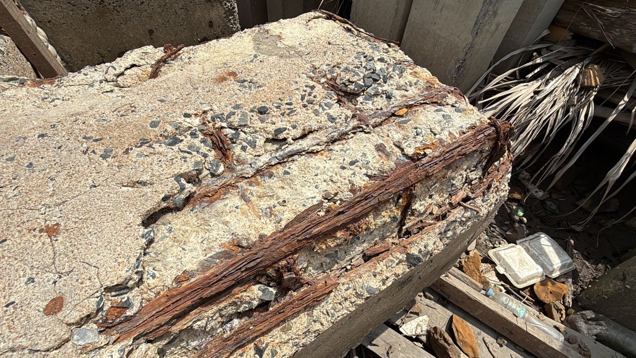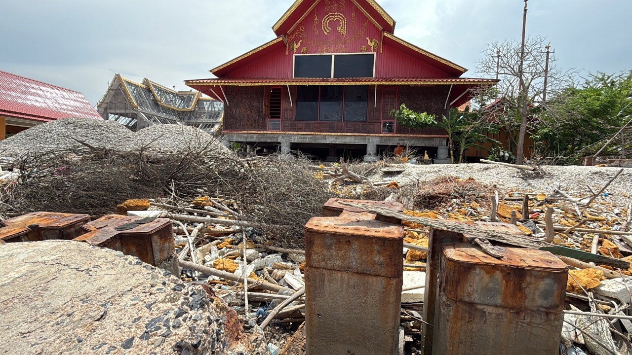จากการเดินสำรวจเขื่อนริมคลองที่มีสภาพเก่า เหล็กเส้นด้านในผุกร่อนโผล่ออกมาให้เห็น พบเสาเข็มที่ยังตอกไม่เสร็จ ลักษณะเอนเข้าหาคลอง ปักอยู่เป็นจำนวนมาก ขนาดสั้นบ้างยาวบ้าง และมีบางส่วนยังถูกกองทิ้งไว้ ถัดไปประมาณ 5 เมตรจากริมเขื่อน มีอาคารพิพิธภัณฑ์เก็บของเก่า ซึ่งวัดใช้เป็นสถานที่ให้นักท่องเที่ยวเข้าเยี่ยมชม ด้านในมีเศียรพ่อแก่ขนาดใหญ่และวัตถุโบราณจำนวนมาก สังเกตดูพบเสาค้ำยันตัวอาคารต้นสุดท้ายเอียง หัก เหล็กเส้นด้านในโผล่หลุดออกมา สาเหตุจากการก่อสร้างเขื่อนริมคลองไม่เสร็จทำให้ดินสไลด์ ดึงเสาเอียง