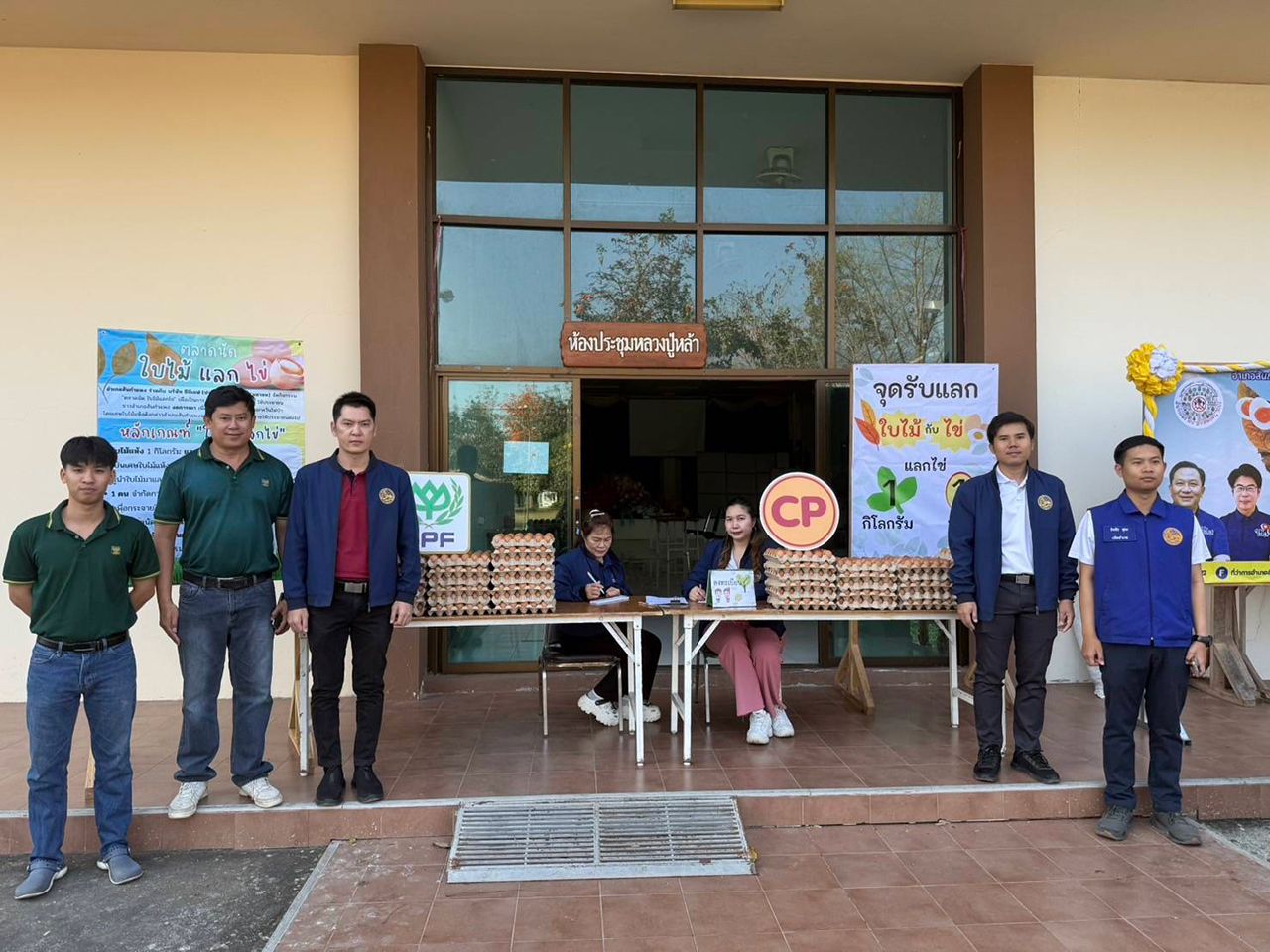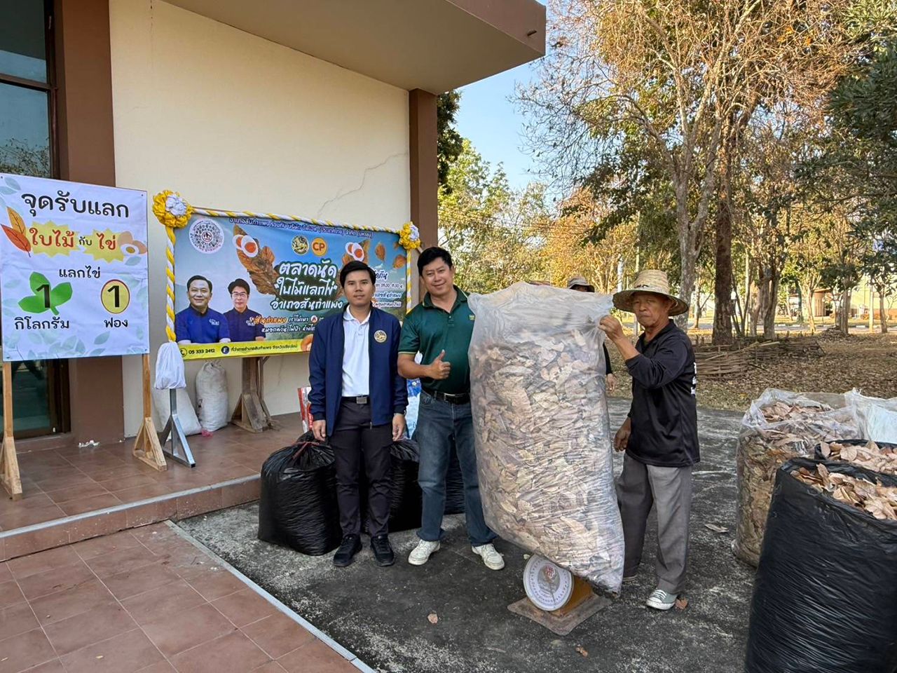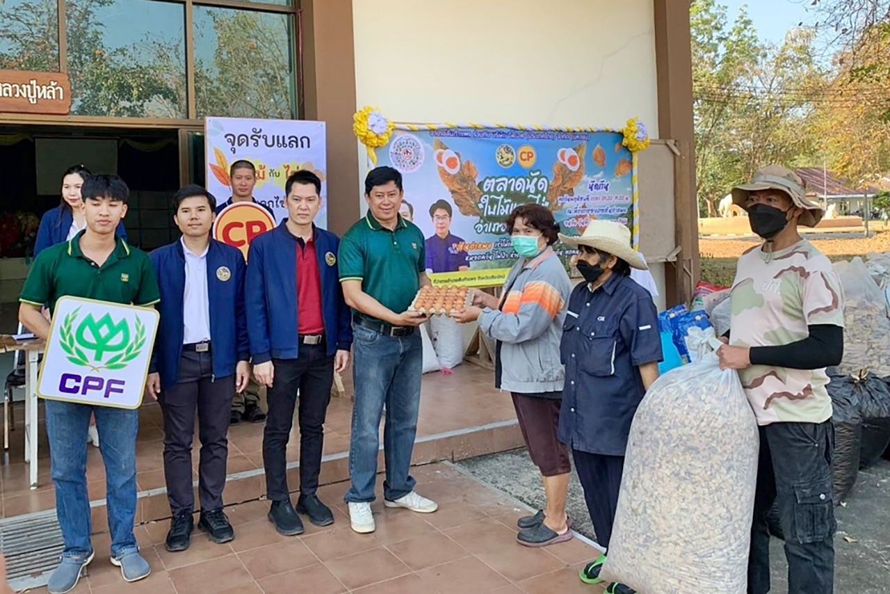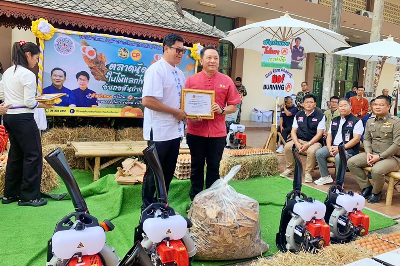 หนึ่งในโครงการที่โดดเด่นและได้รับการตอบรับอย่างดีคือ "ตลาดนัดใบไม้แลกไข่" ที่อำเภอสันกำแพง ซึ่งเป็นความร่วมมือระหว่างที่ว่าการอำเภอสันกำแพงและซีพีเอฟ โครงการนี้เริ่มดำเนินการตั้งแต่เดือนมีนาคม 2568 ด้วยแนวคิดที่เรียบง่ายแต่ทรงพลัง คือการเชิญชวนชาวบ้านในพื้นที่ให้รวบรวมเศษใบไม้แห้งจากบ้านเรือนและไร่สวน แทนการเผาทิ้ง แล้วนำมาแลกกับไข่ไก่สดที่สนับสนุนโดยฟาร์มคอมเพล็กไก่ไข่สันกำแพงของซีพีเอฟ