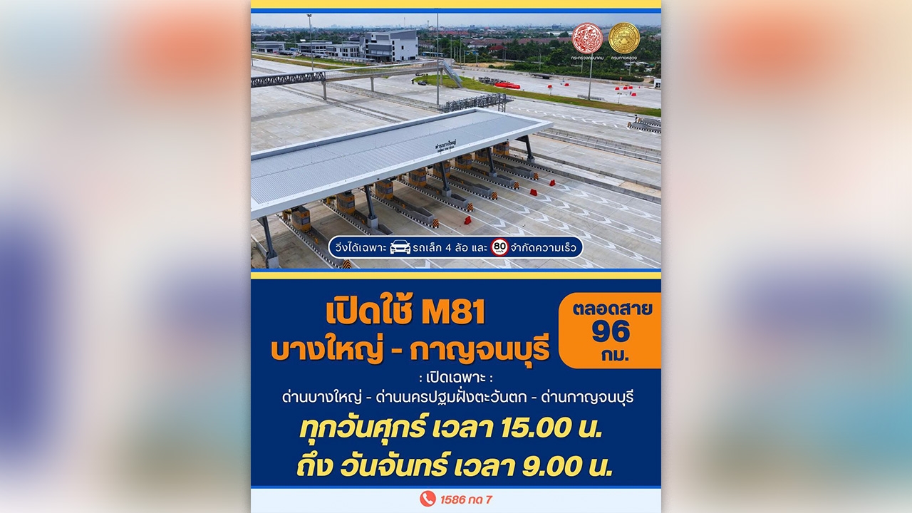 เปิดใช้ M81 บางใหญ่-กาญจนบุรี ตลอดสาย ระยะทาง 96 กิโลเมตรทุกวันศุกร์ เวลา 15.00 น. ถึงวันจันทร์ เวลา 9.00 น.เข้า-ออก เฉพาะ 3 ด่าน
