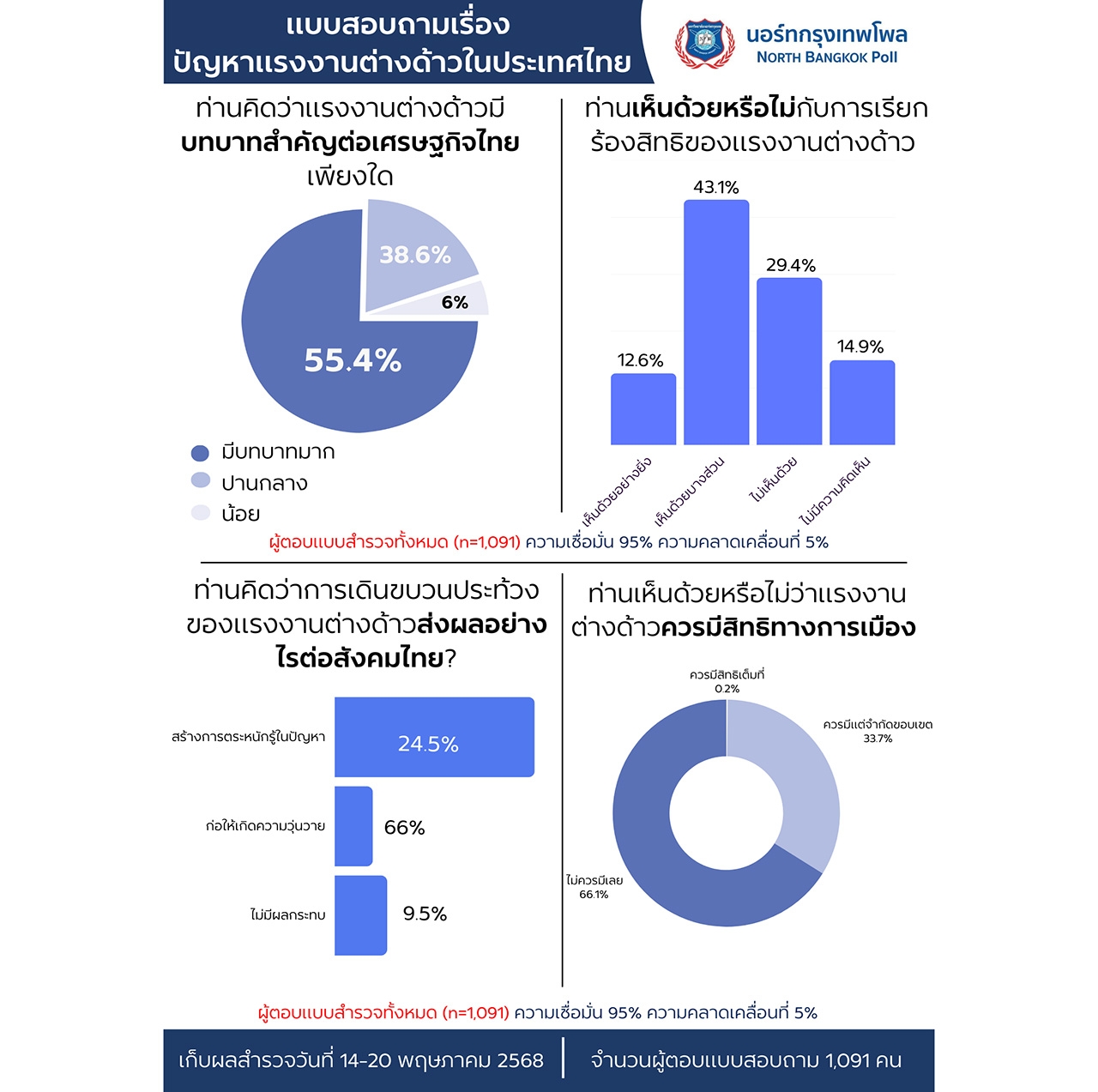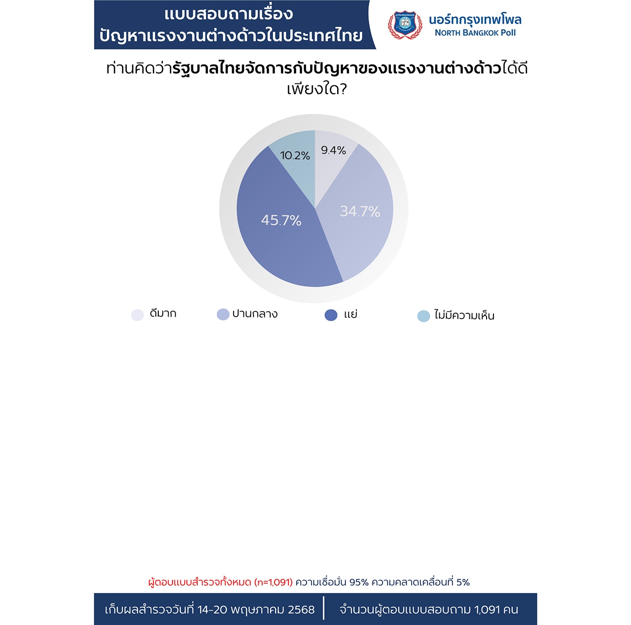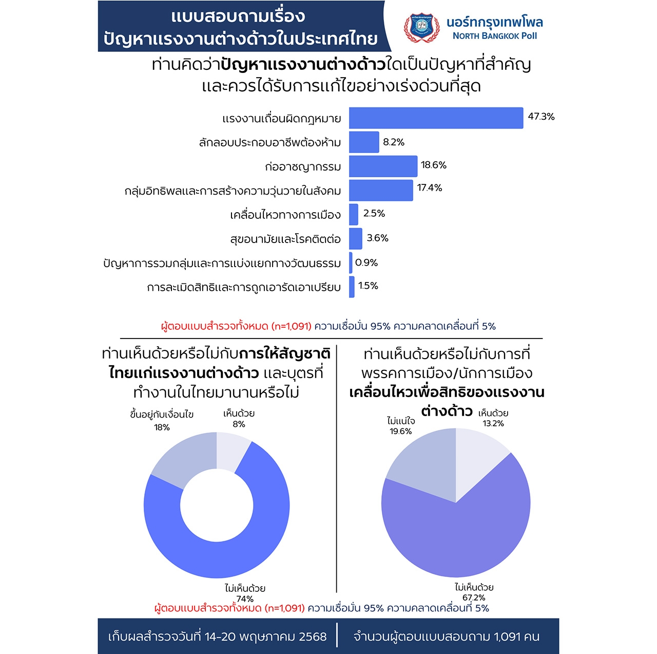 ผศ.ดร.สานิต ศิริวิศิษฐ์กุล ศูนย์สำรวจความคิดเห็น “นอร์ทกรุงเทพโพล” เปิดเผยผลจากการสำรวจความคิดเห็นของประชาชนต่อ "ปัญหาแรงงานต่างด้าวในประเทศไทย" ในวันที่ 14 - 20 พฤษภาคม 2568 จำนวนตัวอย่าง 1,090 ตัวอย่าง จากประชาชนทุกภูมิภาคทั่วประเทศ ที่ค่าความเชื่อมั่นร้อยละ 95