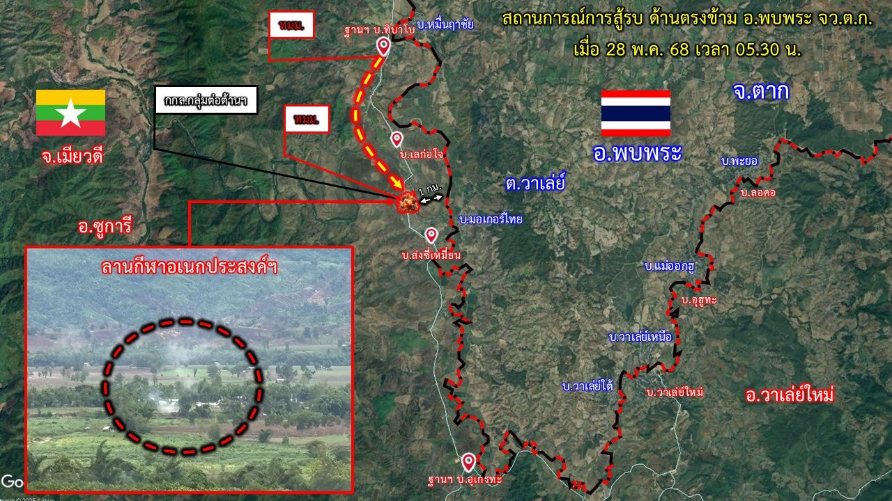 เกี่ยวกับเรื่องนี้ เมื่อเวลา 14.00 น. วันที่ 28 พฤษภาคม 2568 ที่ จ.ตาก ผู้สื่อข่าวรายงานว่า ก่อนหน้านี้เวลาประมาณ 13.00 น. ทางทหารเมียนมาใช้อากาศยาน แบบ YAK-130 จำนวน 1 ลำ ทิ้งระเบิด จำนวน 4 ลูก โจมตีกองกำลังทหารกะเหรี่ยง กอทูเล หรือ KNLA บริเวณพื้นที่ หน้าสนามกีฬาอเนกประสงค์ บ.ส่งซีเหมี่ยน อ.ซูการี จ.เมียวดี รัฐกะเหรี่ยง สหภาพเมียนมา ด้านตรงข้าม บ.มอเกอร์ไทย ม.1 ต.วาเลย์ อ.พบพระ จ.ตาก ห่างจากแนวชายแดนริมแม่น้ำเมย เพียงแค่ 1 กิโลเมตร