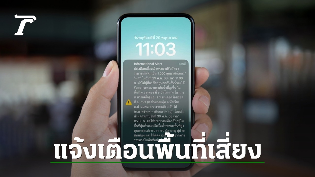 "กรมป้องกันและบรรเทาสาธารณภัย" ส่ง Cell Broadcast และ SMS แจ้งเตือนประชาชนพื้นที่ลุ่มต่ำนอกคันกั้นน้ำ "อ่างทอง-อยุธยา" 9 ตำบล ระดับน้ำเพิ่มสูงขึ้น ขอให้เตรียมยกของขึ้นที่สูง