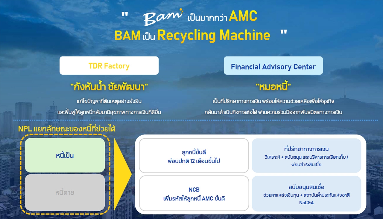 ทั้งนี้ BAM ในฐานะแก้มลิงแห่งชาติ ด้วยบทบาท “หมอหนี้” โดยทำหน้าที่ Recycling Machine มีเป้าหมายในการเร่งสร้างโรงงานแก้หนี้ (TDR Factory) เพื่อฟื้นฟูให้ลูกหนี้กลับมามีสุขภาพทางการเงินที่ดีขึ้น โดยใช้ AI และระบบ Automation ในการสร้างเงื่อนไขปรับโครงสร้างหนี้เฉพาะตัวที่รัดกุม ตรงจุด รวดเร็ว และลดการใช้วิจารณญาณในการแก้หนี้ขนาดเล็ก ขณะเดียวกัน BAM พร้อมร่วมมือกับพันธมิตรจัดตั้ง FA Center ที่เน้นการดูแลลูกหนี้ชั้นดี ผ่อนปกติ 6-12 งวดขึ้นไป ให้ไปต่อได้ ขณะเดียวกัน BAM พร้อมประสานงานกับ NCB เพื่อนำเสนอรหัสดำเนินการใหม่ให้ลูกหนี้ AMC ชั้นดี ทำให้สามารถช่วยเหลือลูกหนี้กลับคืนสู่ระบบเศรษฐกิจแบบยั่งยืน