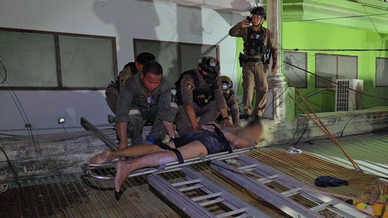 ขณะที่ตำรวจสายตรวจ 4 นาย จึงตัดสินใจปีนขึ้นบนหลังคา พร้อมทั้งดึงตัวให้ลุกขึ้น ก่อนจะควบคุมได้ในที่สุด จากนั้นต้องใช้รถดับเพลิงมาจอดขนาบข้างตึก และนำบันได 2 อันมาพาดก่อนจะนำตัวชายดังกล่าวลงมาจากหลังคาอย่างทุลักทุเล