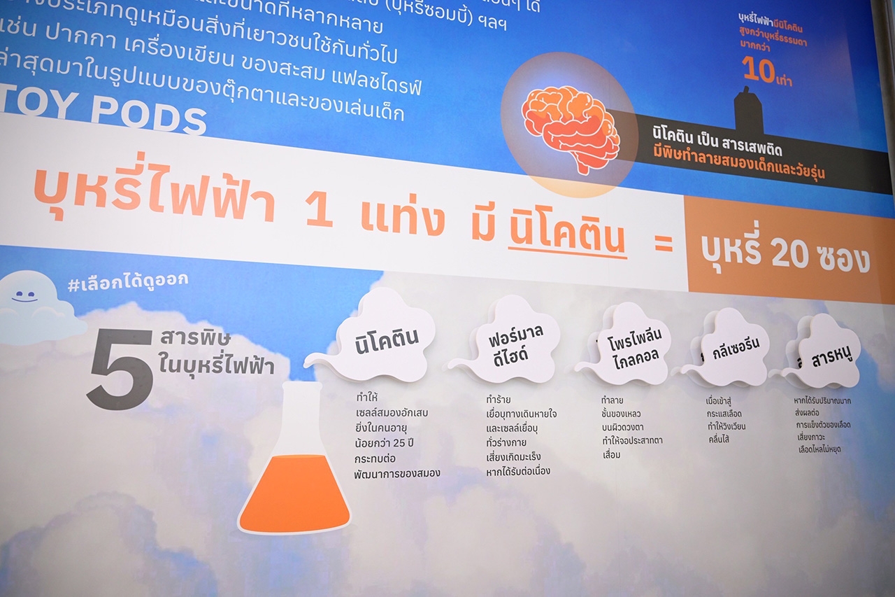 “ที่น่าเป็นห่วงคือ กลุ่มเยาวชนอายุ 15-20 ปี สูบบุหรี่ไฟฟ้าสูงถึง 65.5% ผู้สูบยิ่งอายุน้อยยิ่งมีแนวโน้มสูบบุหรี่ไฟฟ้ามากกว่าสูบบุหรี่มวน เหตุผลหลักที่สูบคือเพื่อคลายเครียด และติดนิโคตินจนไม่สามารถเลิกได้ โดยพบค่าใช้จ่ายจากการสูบบุหรี่มวนอย่างเดียวอยู่ที่ 892.67 บาทต่อเดือน คิดเป็น 7.16% ของรายได้หลัก ค่าใช้จ่ายจากการสูบบุหรี่ไฟฟ้าอย่างเดียวอยู่ที่ 1,080.81 บาทต่อเดือน คิดเป็น 16.43% และสูบทั้งสองอย่างอยู่ที่ 1,290.74 บาทต่อเดือน คิดเป็นร้อยละ 9%” นพ.พงศ์เทพ กล่าว