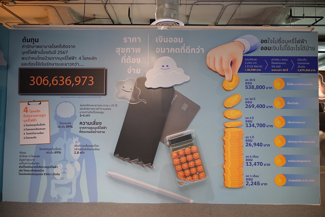วันงดสูบบุหรี่โลก 2568 สสส. สานพลัง ธปท. จัดนิทรรศการมีชีวิต FAKE OR FRESH? - MY LIFE EXHIBITION กระชากหน้ากาก "บุหรี่ไฟฟ้า" แฉกลยุทธ์การตลาดหลอกล่อเด็ก-เยาวชน ชวนพ่อแม่ คนรุ่นใหม่เรียนรู้อันตรายจากบุหรี่ไฟฟ้าแบบอินเตอร์แอคทีฟเปิดเข้าชมฟรี-22 มิ.ย. นี้ ที่ธปท. เผยผลสำรวจ 4 จังหวัดภาคใต้ พบผู้หญิงและกลุ่ม LGBTQIA+ ส่วนใหญ่สูบบุหรี่ไฟฟ้า ยิ่งอายุน้อยยิ่งสูบมากขึ้น ทำภาระค่าใช้จ่ายต่อเดือนสูงขึ้น และสร้างภาระค่ารักษาพยาบาลถึง 306 ล้านบาท