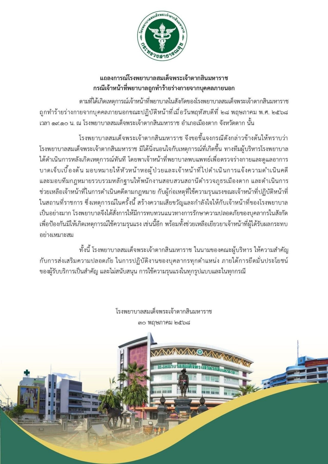 ล่าสุด 30 พฤษภาคม 2568 โรงพยาบาลสมเด็จพระเจ้าตากสินมหาราชได้ออกแถลงการณ์เพื่อชี้แจงต่อกรณีเจ้าหน้าที่พยาบาลถูกทำร้ายร่างกายจากบุคคลภายนอกว่า ตามที่ได้เกิดเหตุการณ์เจ้าหน้าที่พยาบาลในสังกัดของโรงพยาบาลสมเด็จพระเจ้าตากสินมหาราชถูกทำร้ายร่างกายจากบุคคลภายนอกขณะปฏิบัติหน้าที่เมื่อวันพฤหัสบดีที่ 28 พฤษภาคม พ.ศ. 2568 เวลา 19.10 น. ณ โรงพยาบาลสมเด็จพระเจ้าตากสินมหาราช อำเภอเมืองตาก จังหวัดตาก นั้น