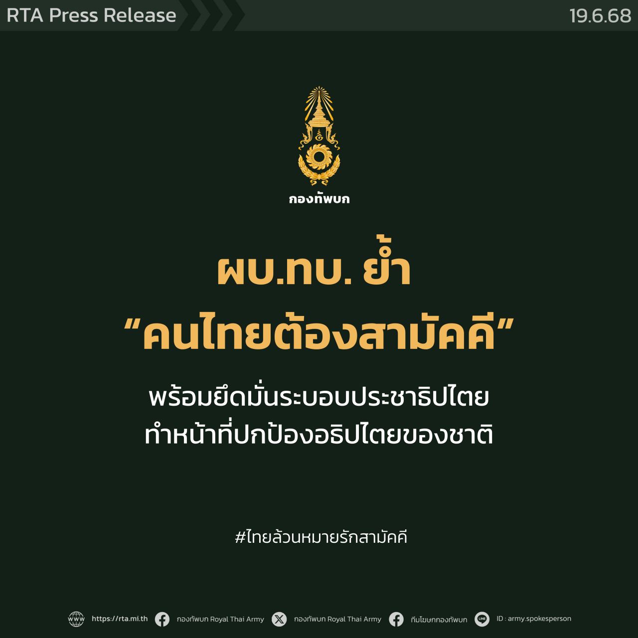 ทั้งนี้ ผู้บัญชาการทหารบกได้เน้นย้ำว่า หากพิจารณาอย่างรอบด้านแล้ว สิ่งที่สำคัญที่สุดในห้วงเวลานี้คือ "คนไทยต้องสามัคคี" ร่วมกันปกป้องอธิปไตยจากผู้ไม่หวังดี โดยยึดถือผลประโยชน์ของชาติเป็นสำคัญ.