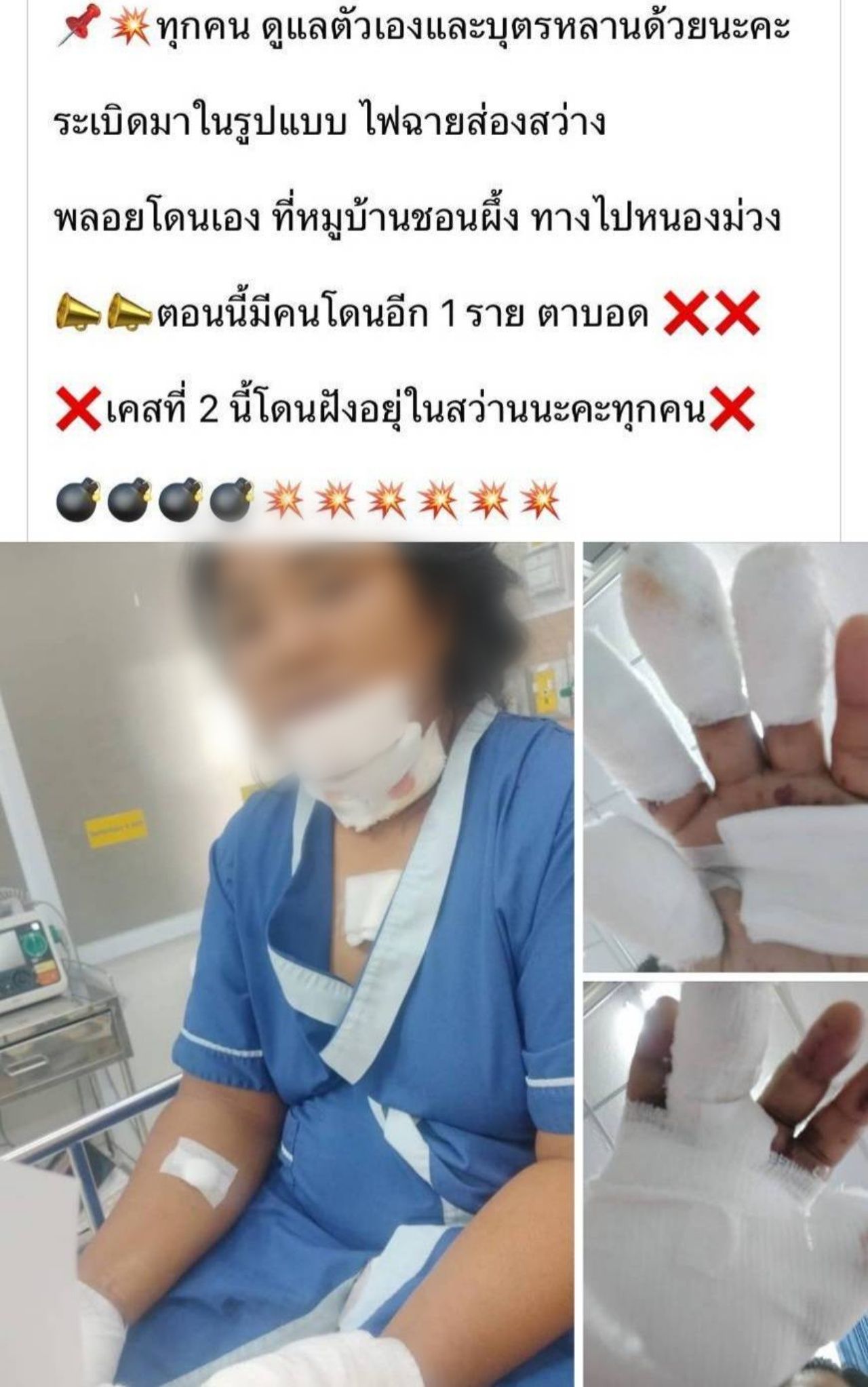 คุณพลอย หรือ คุณสุภนิช ทองสด อาชีพเกษตรกร ที่ได้ออกมาโพสต์เตือนภัย เล่าด้วยความอัดอั้นตันใจกับเรื่องที่ตนเองประสบมาตั้งแต่ต้นว่า ในช่วงที่เก็บไฟฉายคาดหัวได้ก็ทดลองเปิดสวิตช์ ทำให้เกิดระเบิดแบบไม่ทันตั้งตัว หูอื้อไม่ได้ยินอะไรอีกเลย เจ็บปวดไปทั้งร่าง เดชะบุญที่สะเก็ดระเบิดไม่โดนตา แรงระเบิดส่งผลให้มีบาดแผลตั้งแต่ปลายคาง หน้าอก ท้อง มือลงไปถึงเท้า กระดูกนิ้วมือแตกหลายนิ้ว แพทย์เผยถึงขั้นจะต้องตัดทิ้ง จึงต้องขอย้าย รพ.จากลพบุรี ไปรักษาอาการต่อที่ รพ.นครสวรรค์ เพื่อขอรอดูอาการจากแผลก่อน ซึ่งยังไม่ได้ตัดสินใจว่าจะต้องถึงขั้นตัดนิ้ว