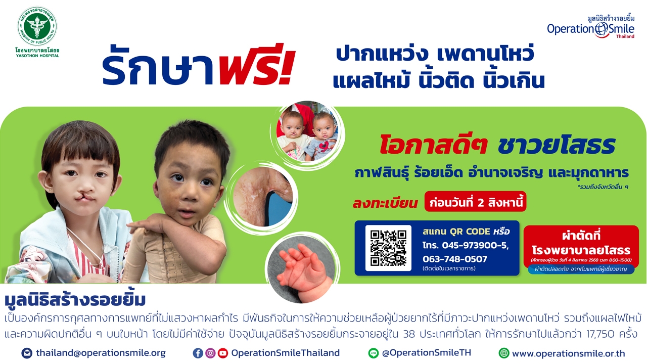 ขอย้ำ วันที่ 4 สิงหาคม 2568 ที่โรงพยาบาลยโสธร รักษาฟรี สำหรับผู้มีภาวะปากแหว่งเพดานโหว่ แผลไฟไหม้ และความพิการบนใบหน้า