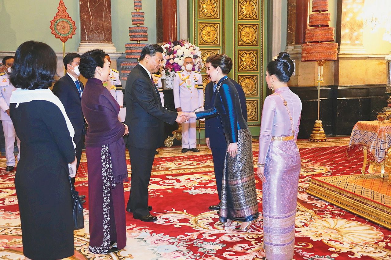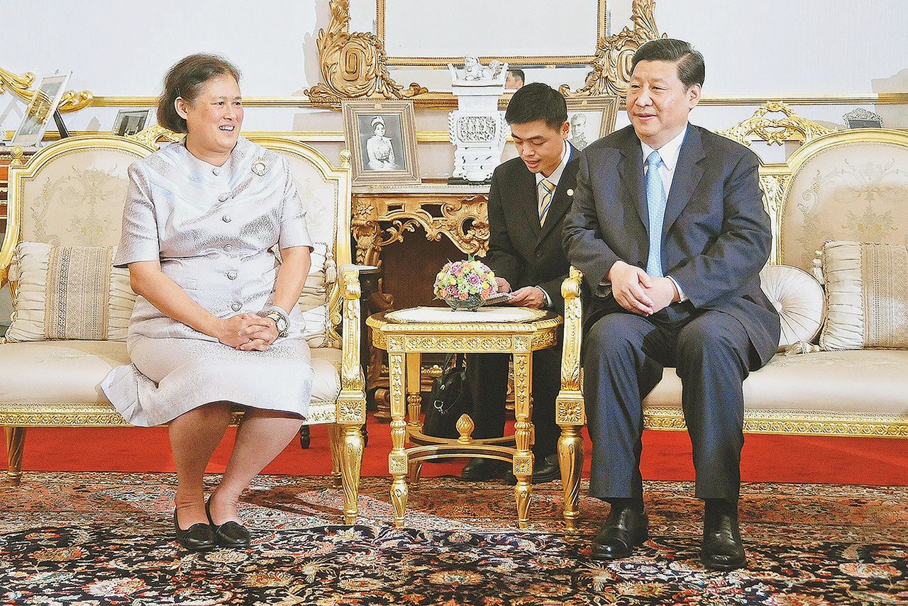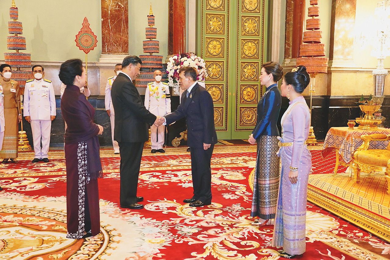 โอกาสนี้ “ประธานาธิบดีสี จิ้นผิง” ได้เข้าเฝ้าฯ “พระบาทสมเด็จพระเจ้าอยู่หัว รัชกาลที่ 10” และ “สมเด็จพระนางเจ้าฯ พระบรมราชินี” ณ พระที่นั่งจักรีมหาปราสาท ในพระบรมมหาราชวัง ซึ่งถือเป็นการพบปะกันครั้งแรก โดย “พระบาทสมเด็จพระเจ้าอยู่หัว” ตรัสว่า พระองค์เคยเสด็จฯ เยือนจีนหลายครั้ง ได้สัมผัสกับขุนเขาสายน้ำที่สวยงาม ความมีชีวิตชีวา และมนต์เสน่ห์ ตลอดจนการพัฒนาที่ก้าวหน้าของประเทศจีนด้วยตนเอง ด้าน “ประธานาธิบดีสี จิ้นผิง” กล่าวว่า จีนยินดีที่จะร่วมกับไทยเชิดชูไมตรีจิตอันพิเศษ “จีนไทยใช่อื่นไกล...พี่น้องกัน” อย่างต่อเนื่อง ร่วมกันสร้างประชาคมจีน-ไทยที่มีอนาคตร่วมกัน และเขียนบทใหม่แห่งความสัมพันธ์ระหว่างสองประเทศ ด้าน “พระบาทสมเด็จพระเจ้าอยู่หัว” ทรงมีรับสั่งตอบว่า ไทยยินดีกระชับความสัมพันธ์ฉันมิตรกับจีนให้แน่นแฟ้นมากยิ่งขึ้น