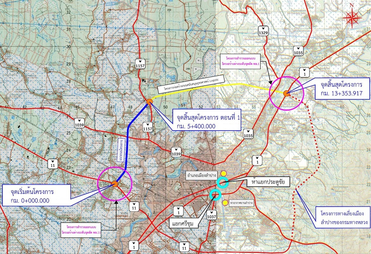 กรมทางหลวงชนบท (ทช.) ได้ดำเนินโครงการก่อสร้างถนนทางหลวงชนบทสายแยก ทล.11 - ทล.1 อำเภอเมือง จังหวัดลำปาง (ตอนที่ 1) ซึ่งขณะนี้ได้เริ่มเข้าพื้นที่ก่อสร้างแล้ว ปัจจุบันอยู่ระหว่างการดำเนินงานในส่วนของการปรับเกลี่ย บดอัดคันทางเดิม งานวางแนว ระดับถนน/สะพาน และงานเจาะสำรวจชั้นดินสำหรับงานโครงสร้างสะพาน โดยคาดว่าจะก่อสร้างแล้วเสร็จสมบูรณ์ในปี 2570 ต่อไป